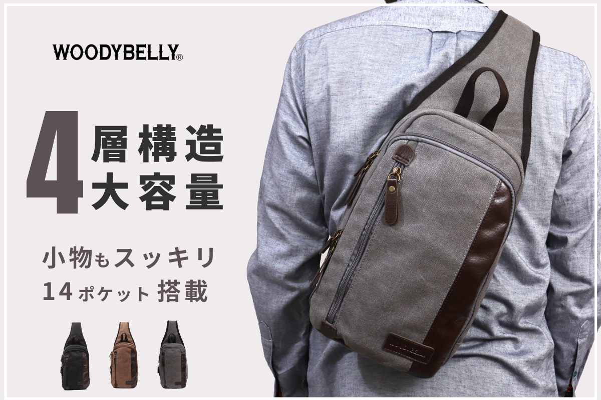 14ポケット多収納 iPadも入る大容量帆布スリングバッグ