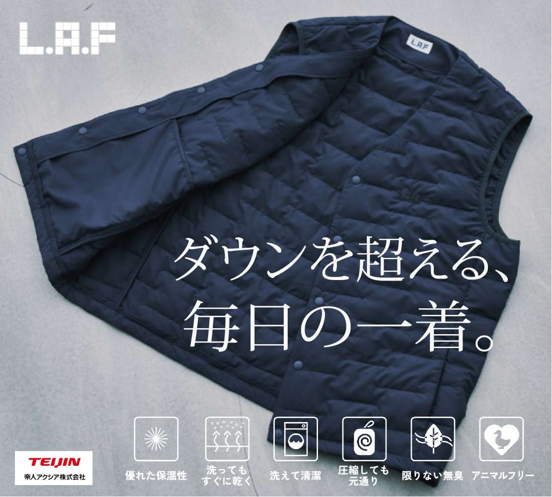 【L.A.F 帝人ミノテック・エアーフレイクベスト】羽毛のように軽くて、暖かい。そして洗える。生体模倣技術から生まれたベスト誕生!