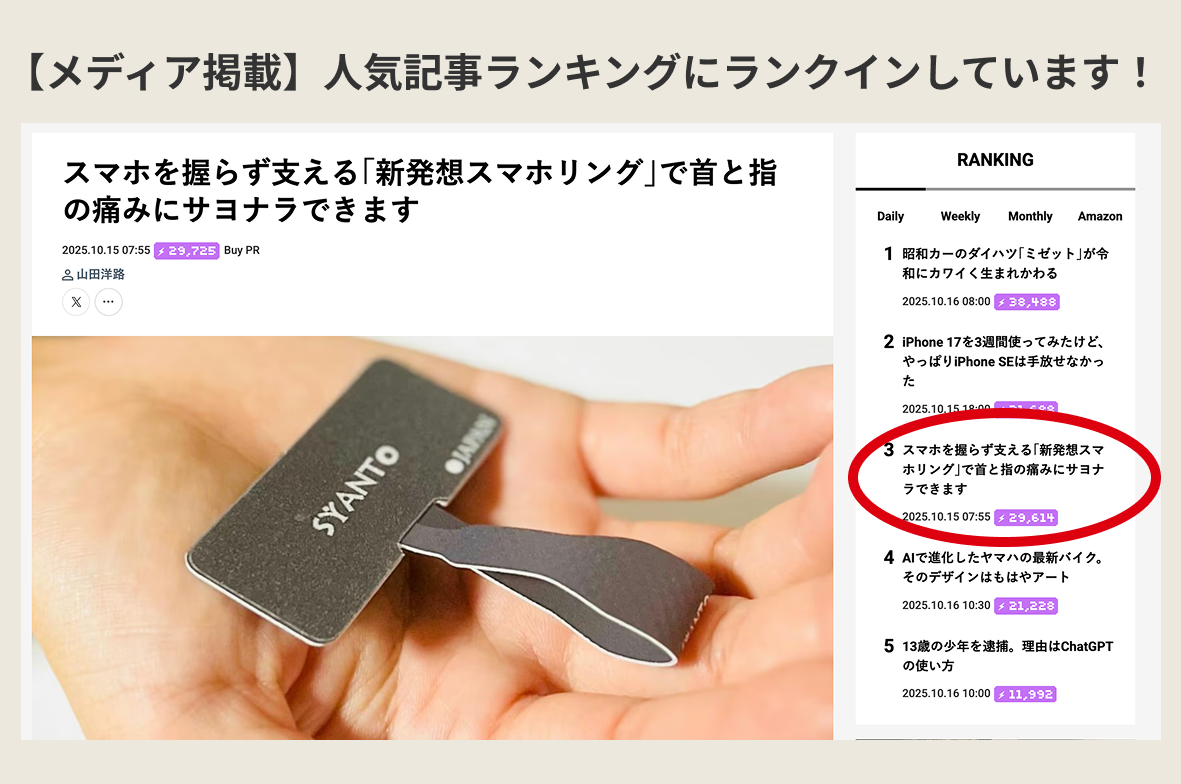 『スマホを握らず支える「新発想スマホリング」で首と指の痛みにサヨナラできます』
