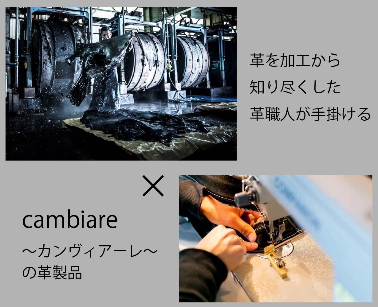 cambiare~カンヴィアーレ~です。私たちが住む兵庫県たつの市は、全国シェア約70%を誇る革の一大産地です。そんな革の産地から生まれた、cambiare~カンヴィアーレ~製品の企画から制作まで全て担うのは、革を熟知した職人です。