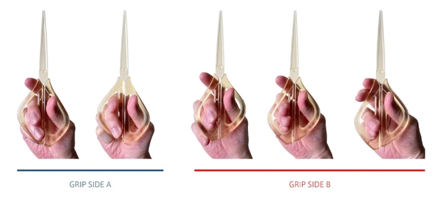 例えば、GRIP SIDE Aの持ち方で違和感がある人は、GRIP SIDE Bのようにハサミをひっくり返して握った場合に握りやすくなるといった具合に、グリップの位置関係が変わる事で、最適な握り方が見つかるようになっております。
