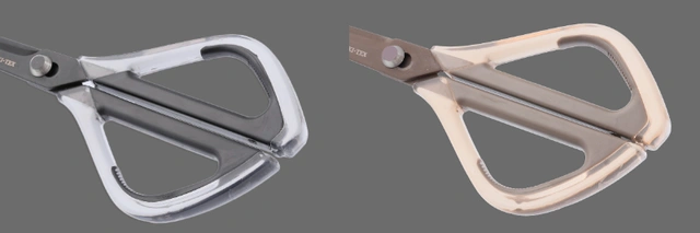 マットな色味がついており、持ち手から刃体にかけて同系色デザインとなっております。機能としても、ガムテープや湿布などの粘着物を切ってもべたつきにくい仕様となります。ブラックとグレージュの2色展開です。