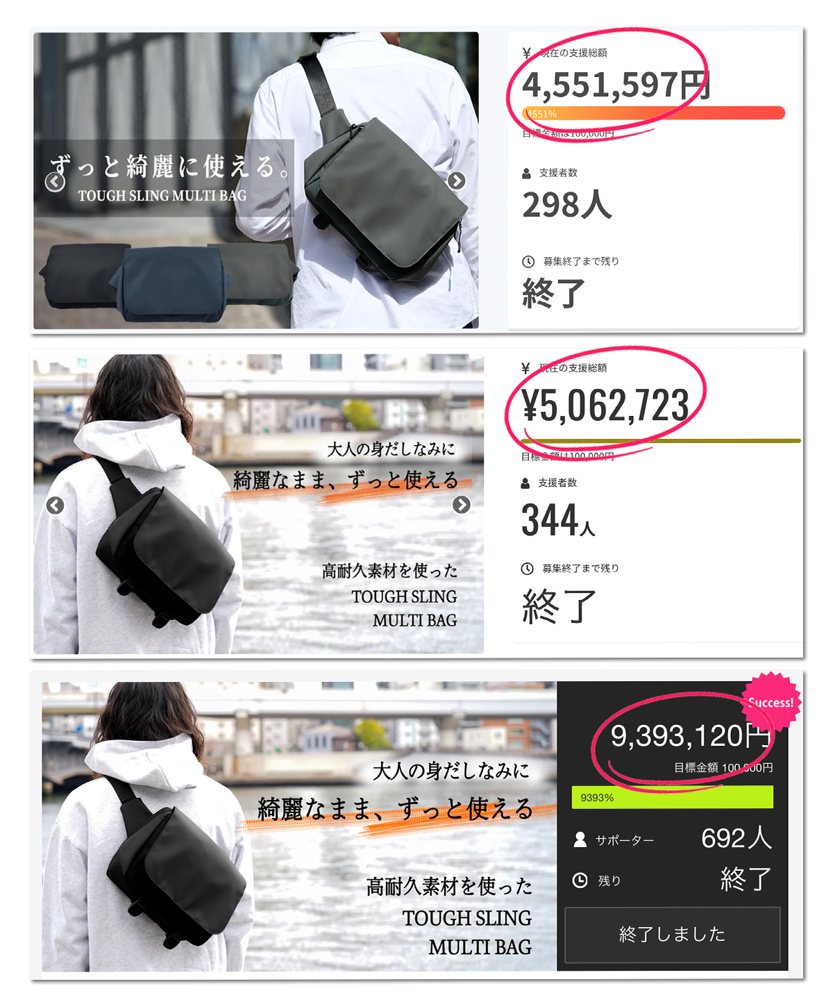 タフスリングマルチバッグは、これまで1,400名を超える方にお届けすることができ、その累計販売額は2,000万円を突破しました!