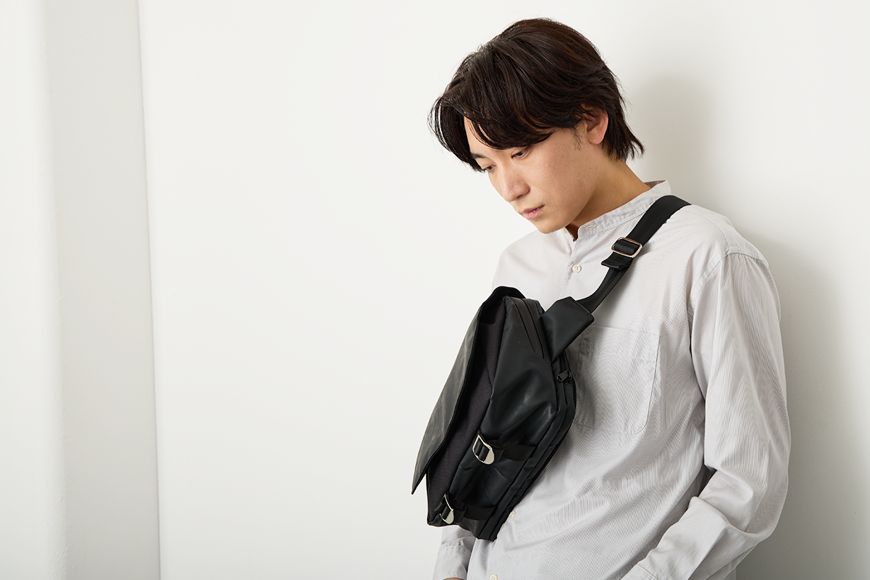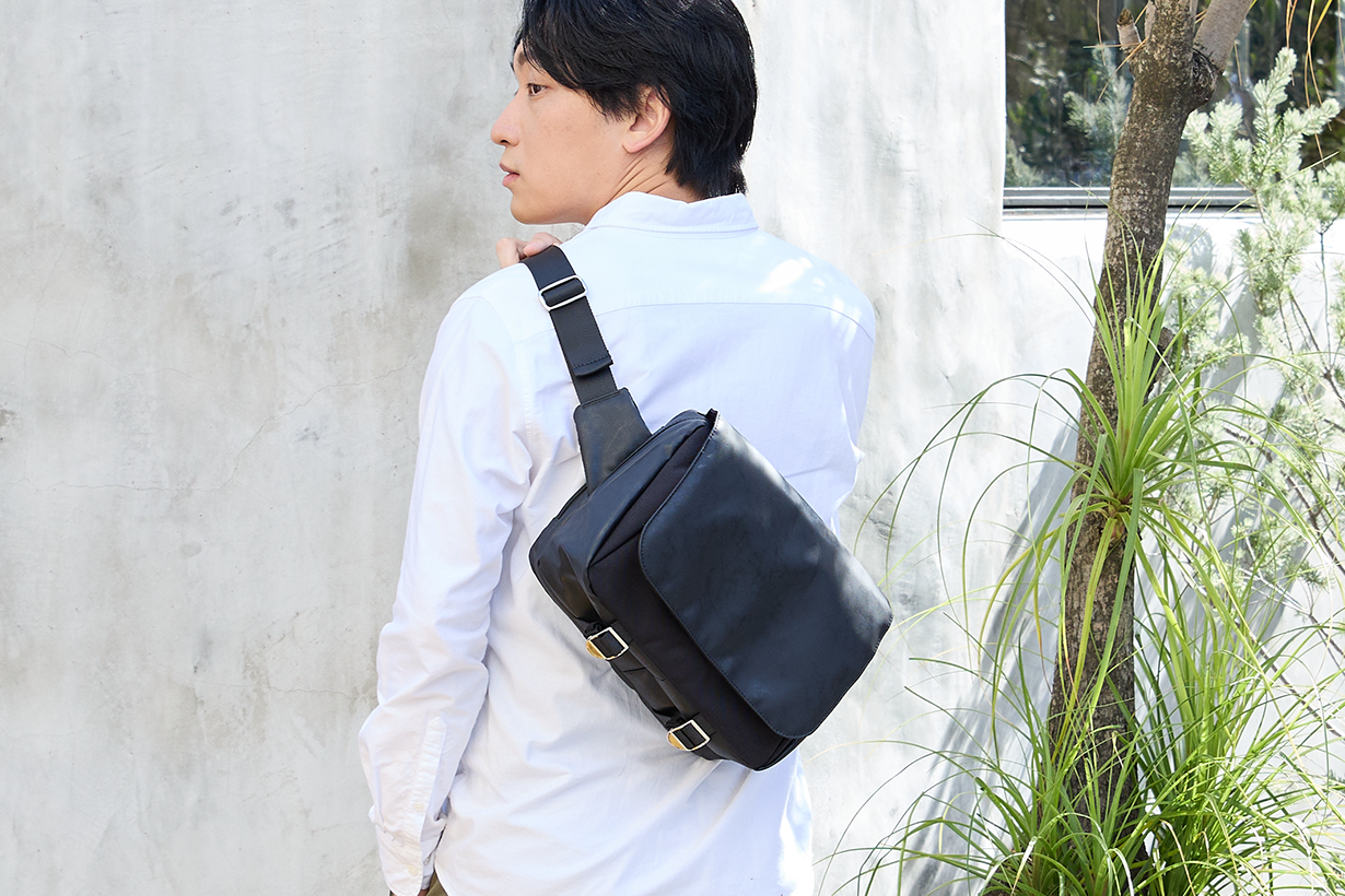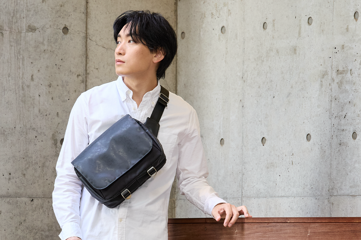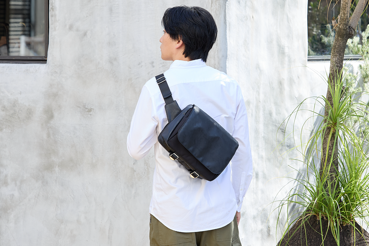 高い耐久性と、高耐久生地に施したアンティーク加工による長く持続する高級感が備わったスリングバッグが、皆さまの毎日の相棒になってくれることを願っています。