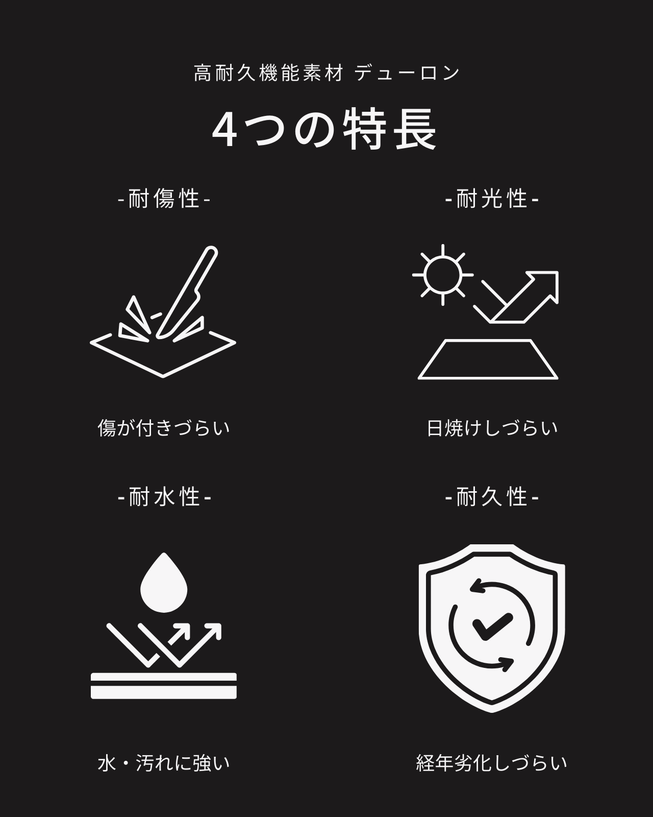 傷が付きにくい表面強度や耐水性、日焼けしづらい耐光性に経年劣化しづらい耐久性など、あらゆる物性試験をクリアした高耐久の機能素材です。
