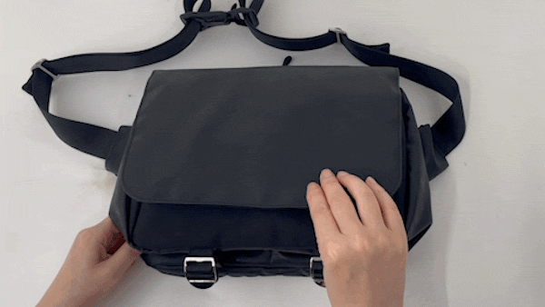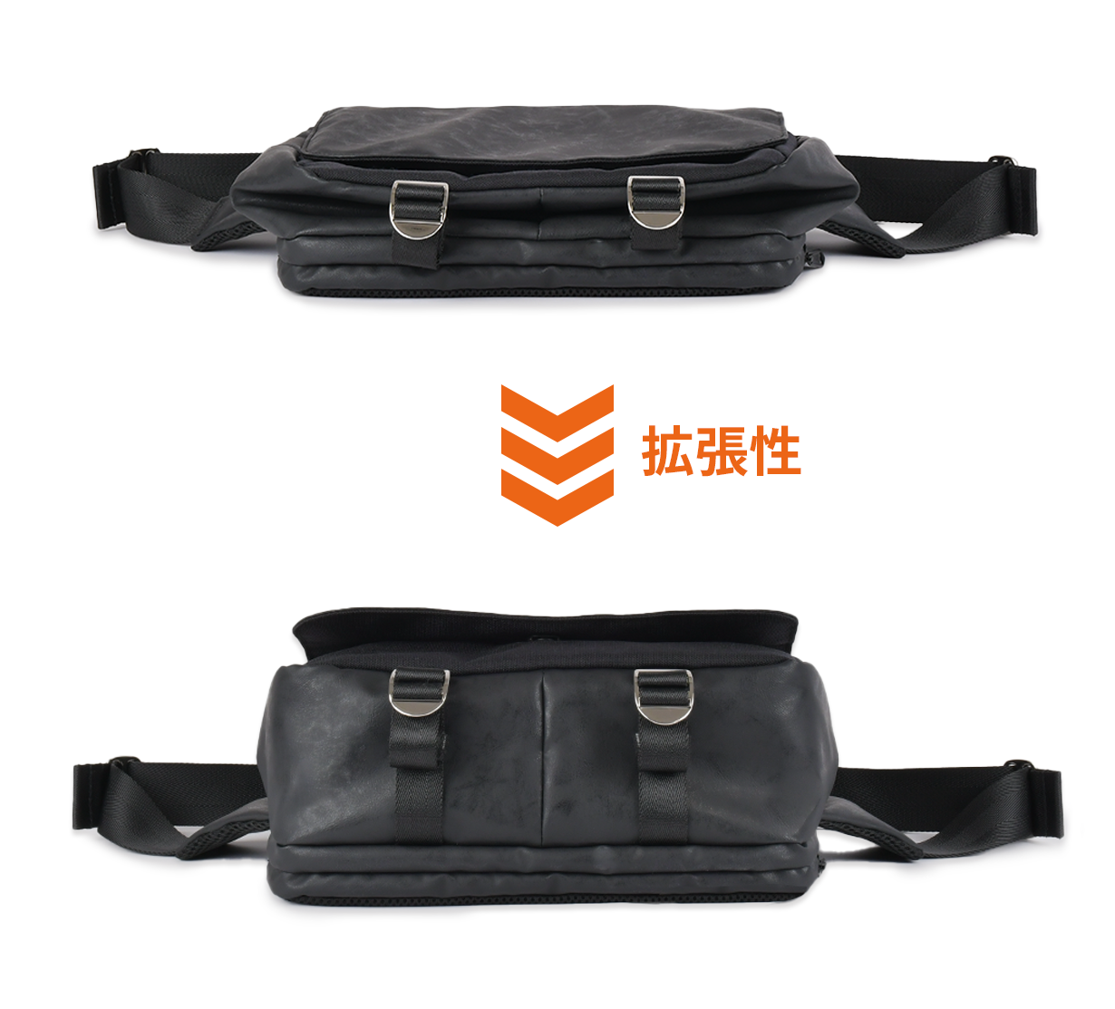 通常時はコンパクトなスリングバッグですが、底部分のベルトを調整することで、マチを13cmまで拡張することができます。