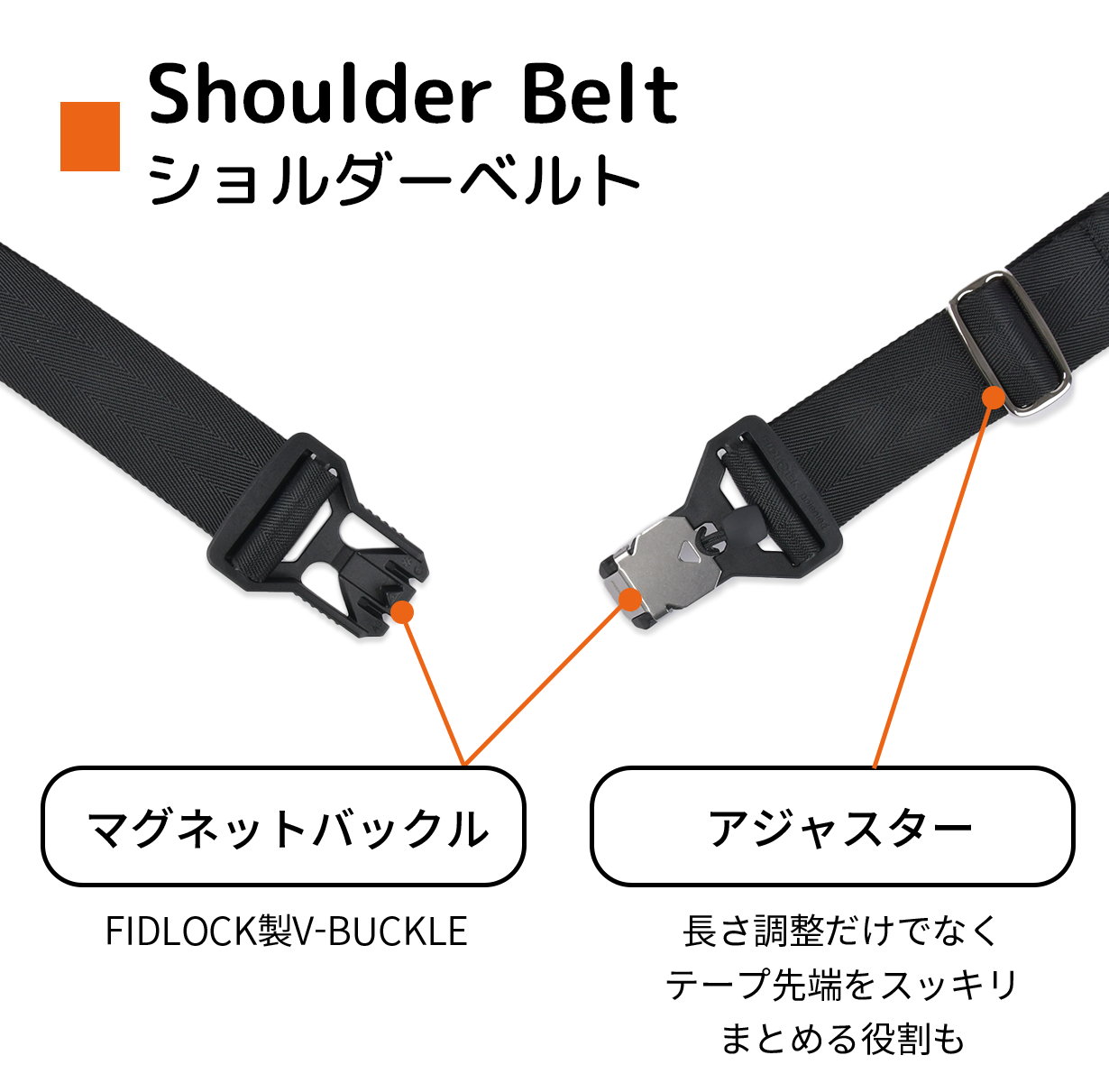 ショルダーベルトには、ドイツのパーツブランドFIDLOCKのマグネットバックルを使用しています。