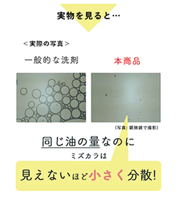 ミズカラは、油を”超”細かくして、再結合させないことが特徴です。