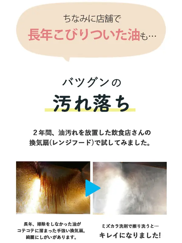 「ミズカラ」は、頑固な油汚れや食品汚れにも強力にアプローチ。食品加工工場や飲食店の現場でも、その実力が実証されています。