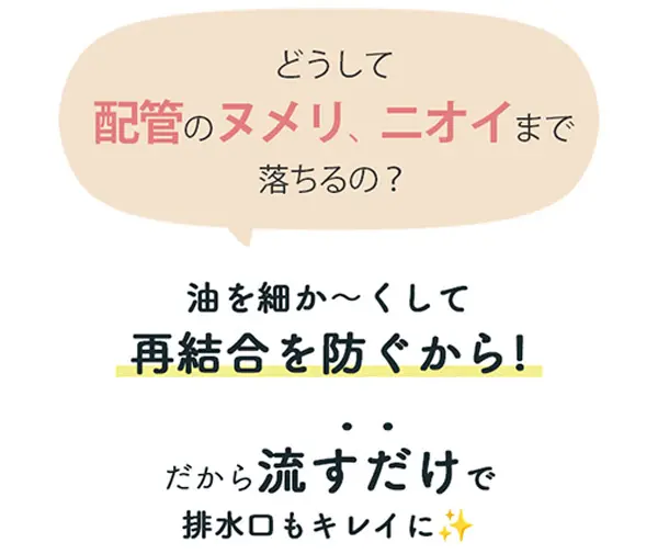 シンクや水回りのぬめり、悪臭・害虫、パイプの劣化防止、配管内の汚れをナノレベルに微細化。