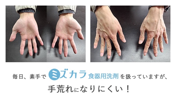 一般洗剤を使うと手荒れしてしまう技術者ですが、ミズカラ洗剤では、手荒れ防止のためにつけていた、面倒な「食器洗い手袋」も不要になりました。