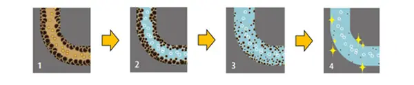 油を100万分の1mmにまで微細化できるので、新たな付着を抑え、硬化してしまった油も徐々に溶解させます。