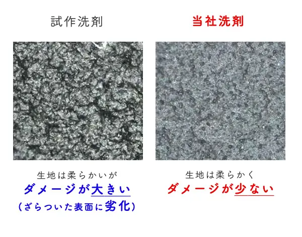 新品のネオプレーン生地を使用し、同時間、同条件で生地への影響をテスト。洗浄テスト後の生地表面の比較が下記となります。