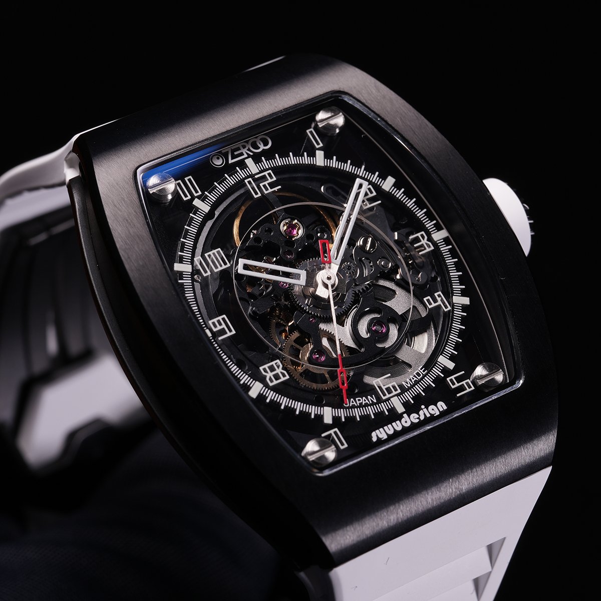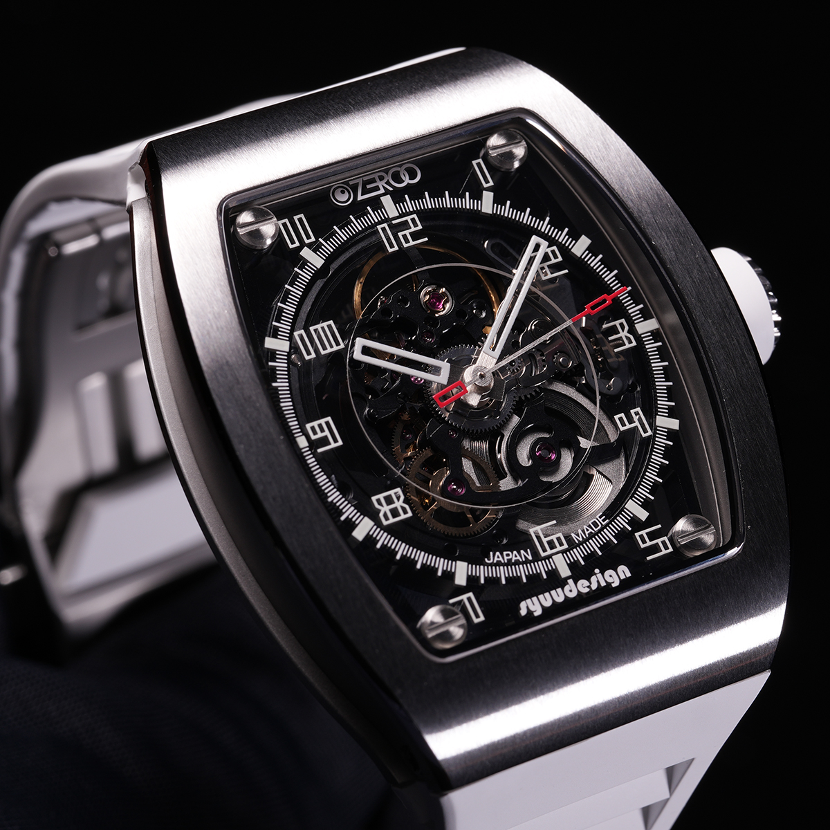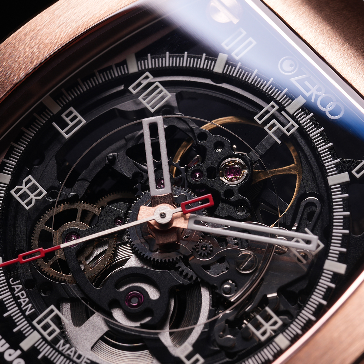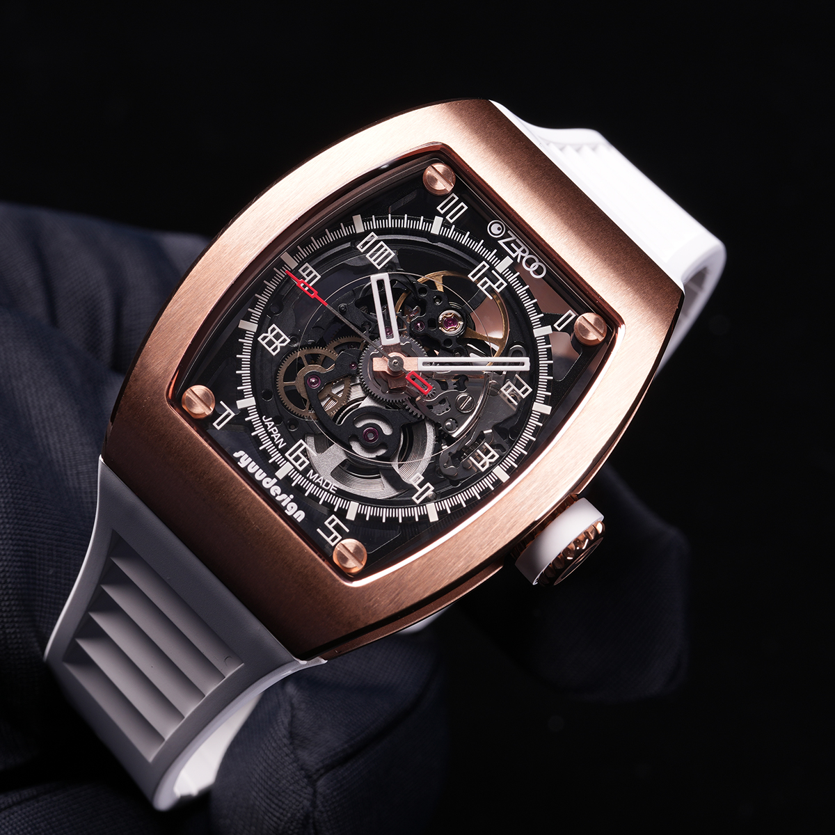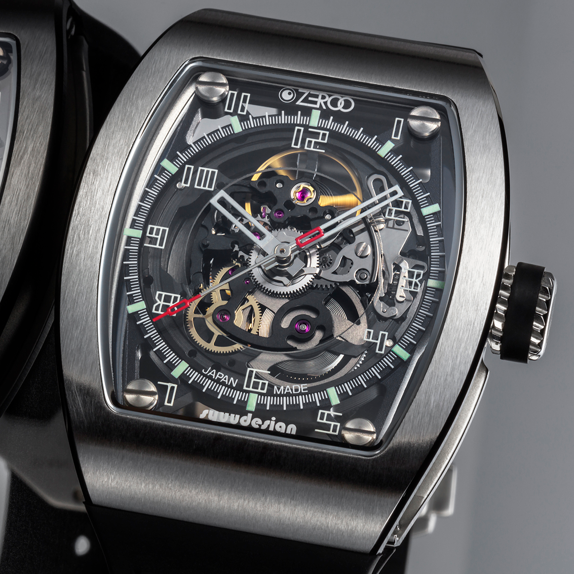 ショーケースのように美しい新設計トノー型ケースの中に繊細なスケルトン機械式自動巻きムーブメントを収めた全く新しいZEROO M2が誕生しました。