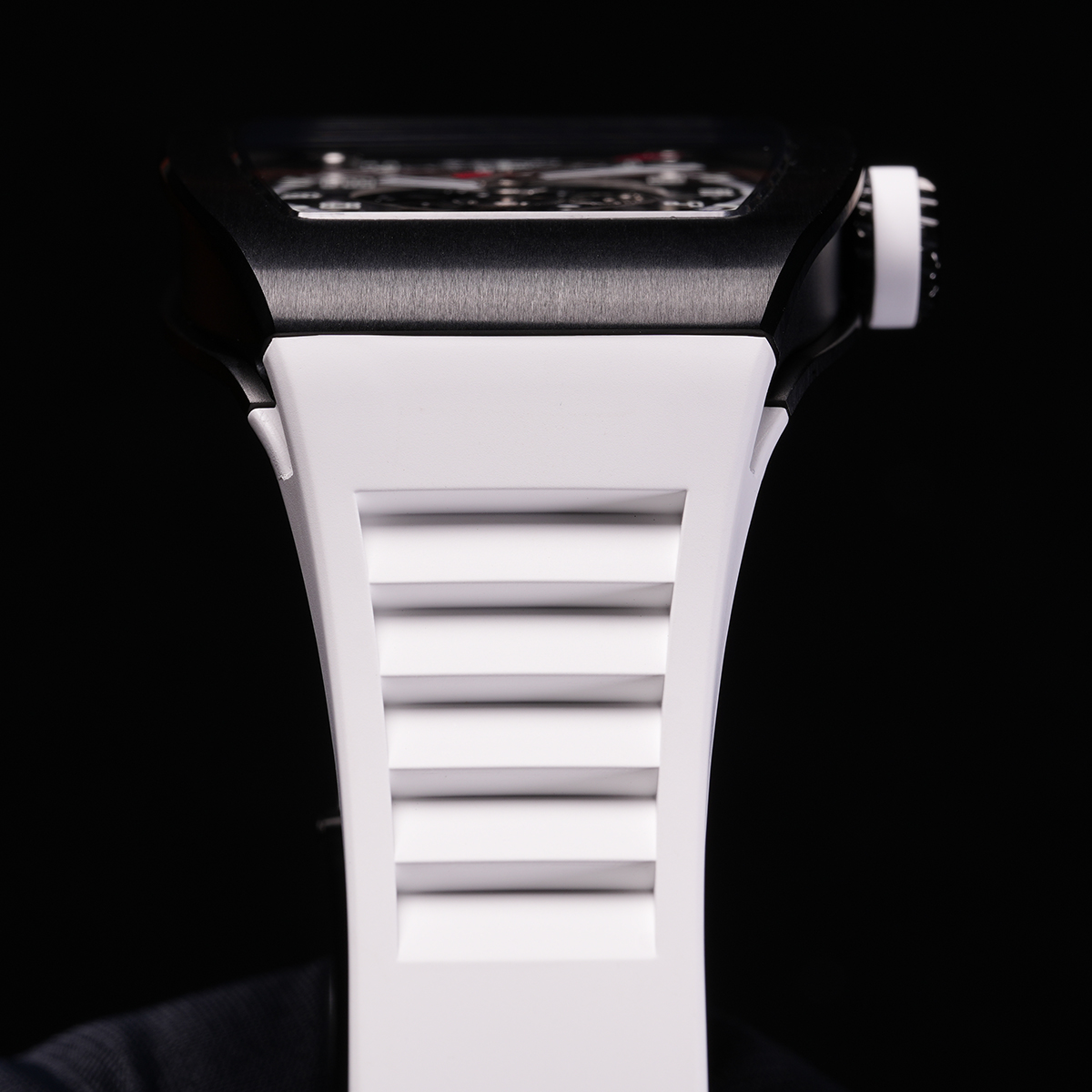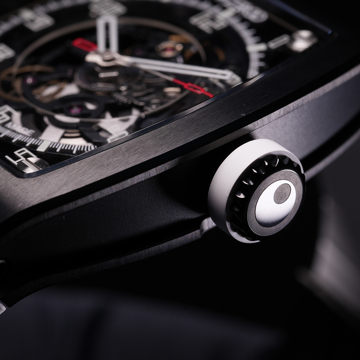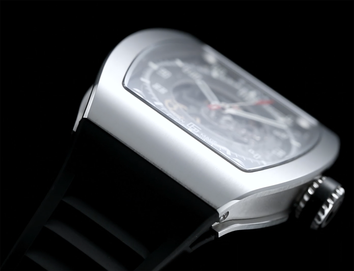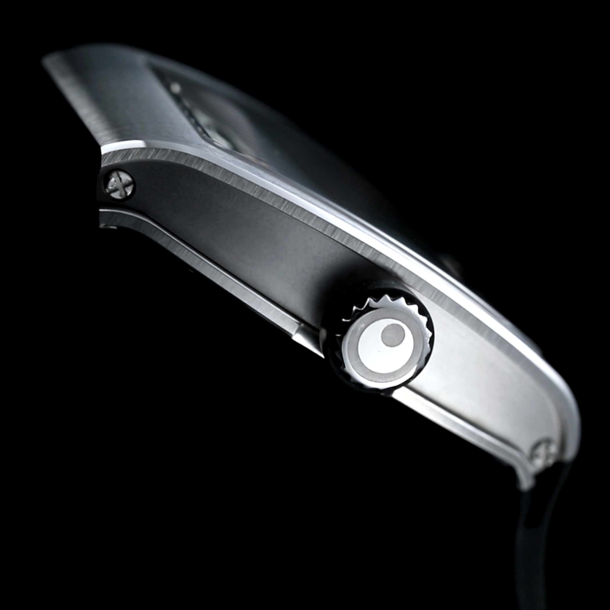 ケースの存在感に負けない力強い造形の大型クラウンにはラバーの滑り止めを配置しました。このラバーリングは高い操作性をもたらすだけでなく、時計全体のデザインにスポーティーな躍動感と素材の統一感を与えています。金属の冷徹な輝きとラバーの質感が織りなすコントラストはM2をモダン・ラグジュアリーな存在へと押し上げる重要なデザインピースです。