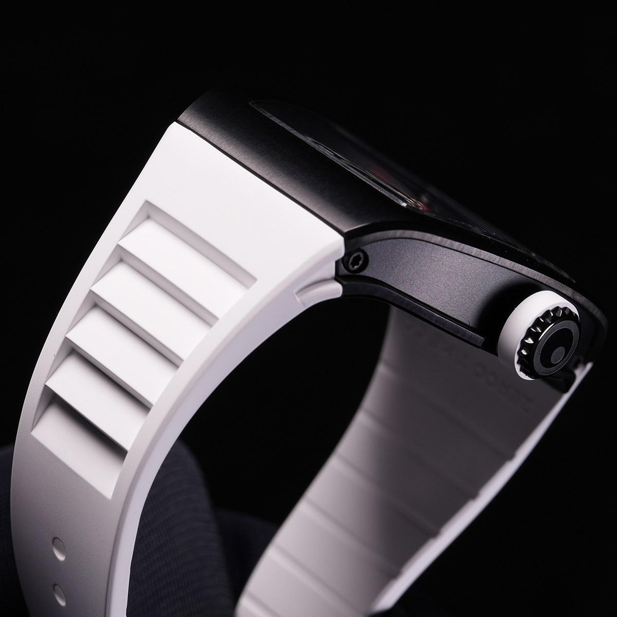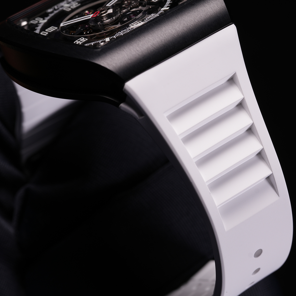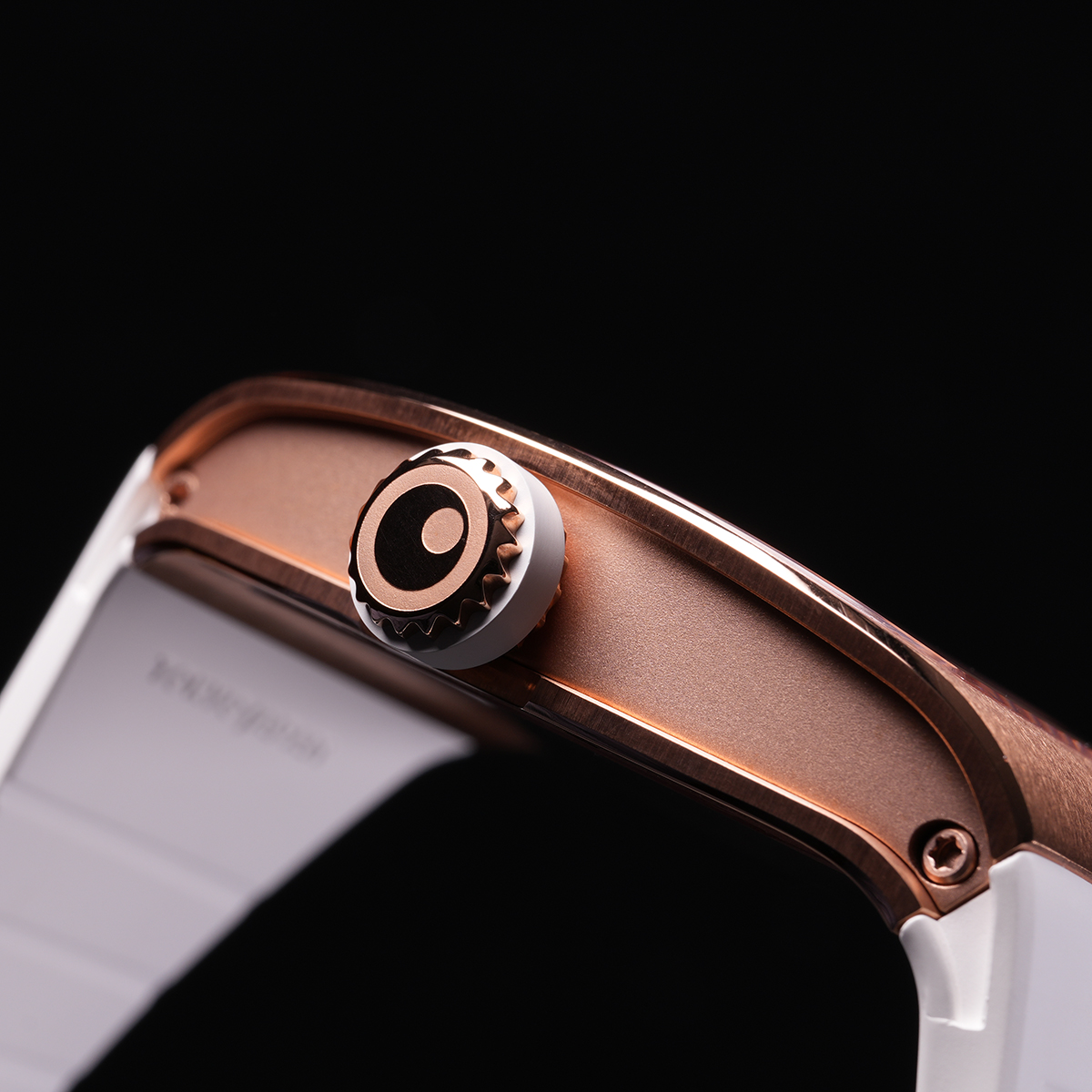 ケースの存在感に負けない力強い造形の大型クラウンにはラバーの滑り止めを配置しました。このラバーリングは高い操作性をもたらすだけでなく、時計全体のデザインにスポーティーな躍動感と素材の統一感を与えています。金属の冷徹な輝きとラバーの質感が織りなすコントラストはM2をモダン・ラグジュアリーな存在へと押し上げる重要なデザインピースです。