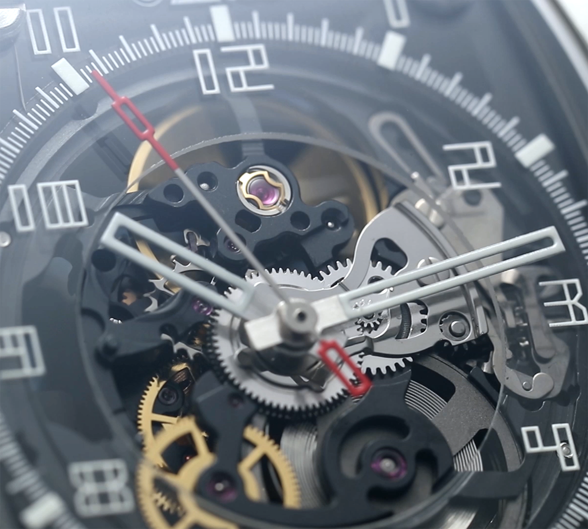 ムーブメントの複雑で精緻な構造と薄いガラスで作られたスケルトン文字盤が心臓部を覆います。精緻な目盛りが刻まれた透明なガラス面に直接配置されたアワーマーカーと60分刻みのミニッツトラックにより、内部機構のダイナミックな動きを愉しみながら、優れた視認性で正確な時を刻みます。