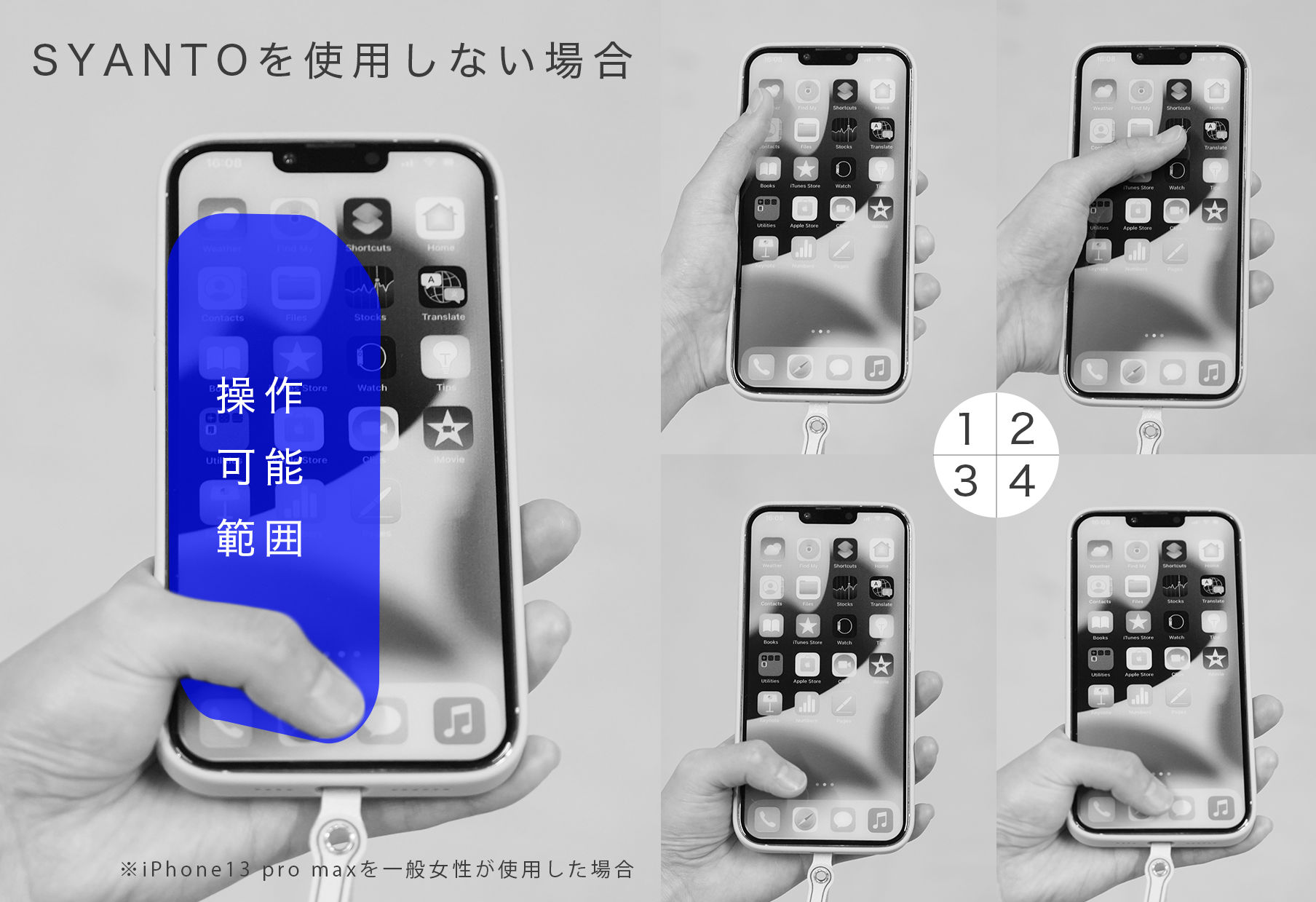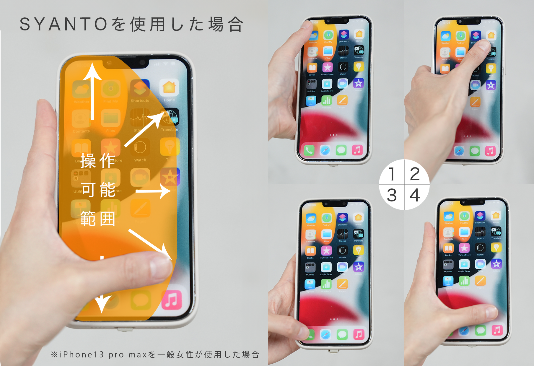 SYANTOを使用しない場合と比較すると、操作可能範囲が大きく変わります。これは手全体が自由になり、5本の指を効果的に使えるようになるからです。