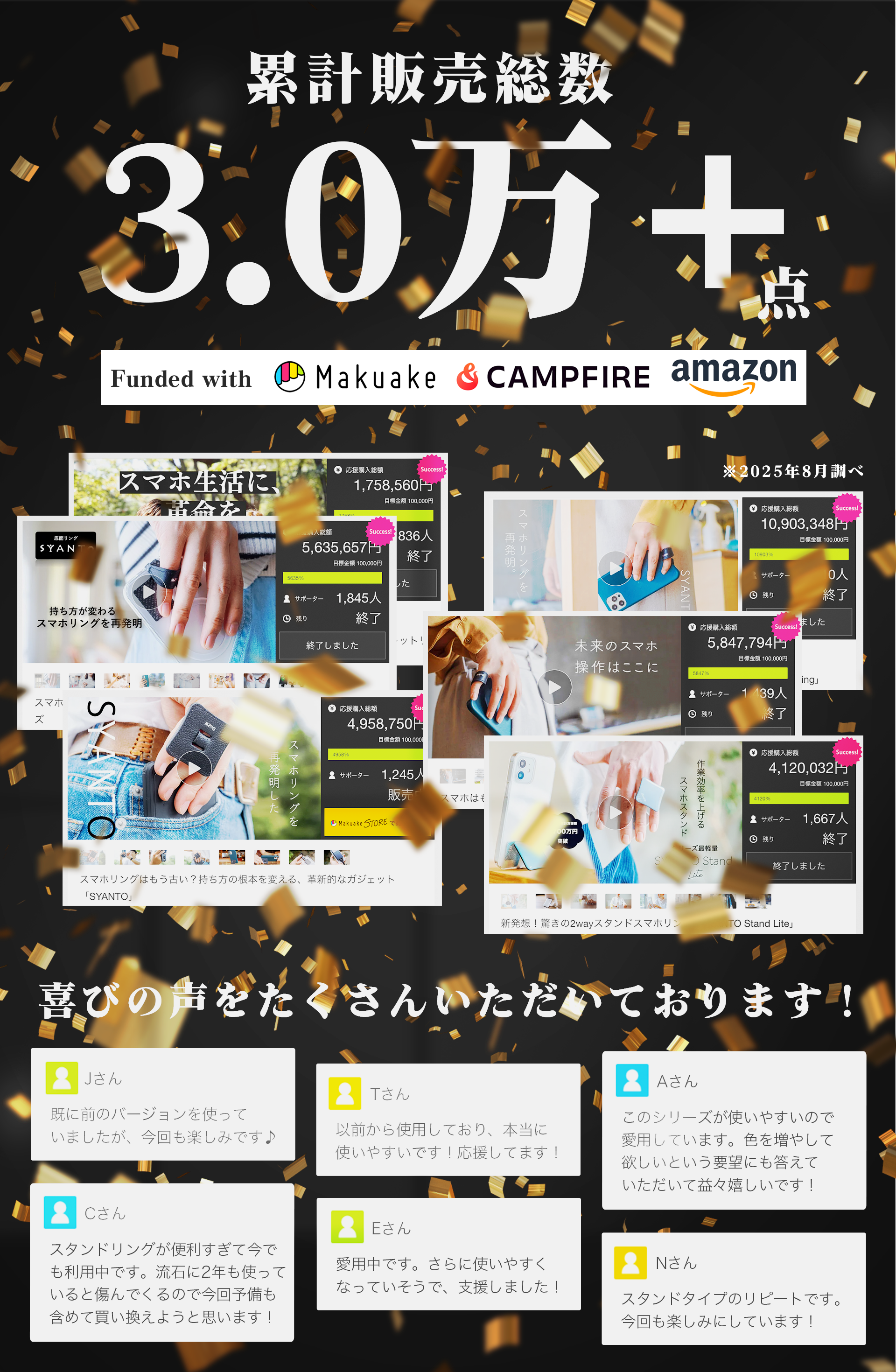 SYANTOはこれまでにMakuake、CAMPFIRE、米国kickstarter、Amazonで累計2.3万人以上の方から支援をいただき、多くの方のスマホ操作の悩み解決に貢献してきました。