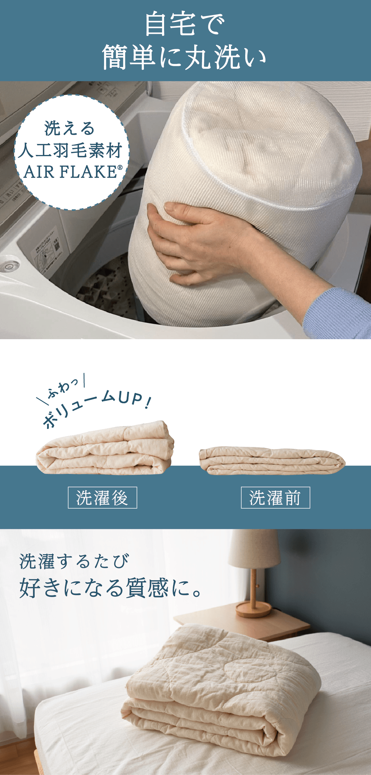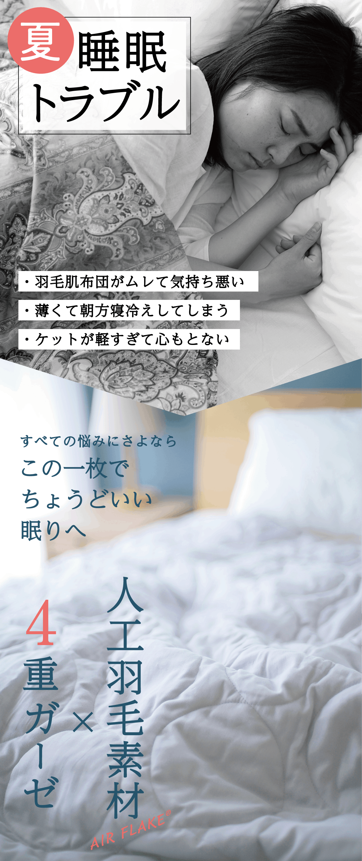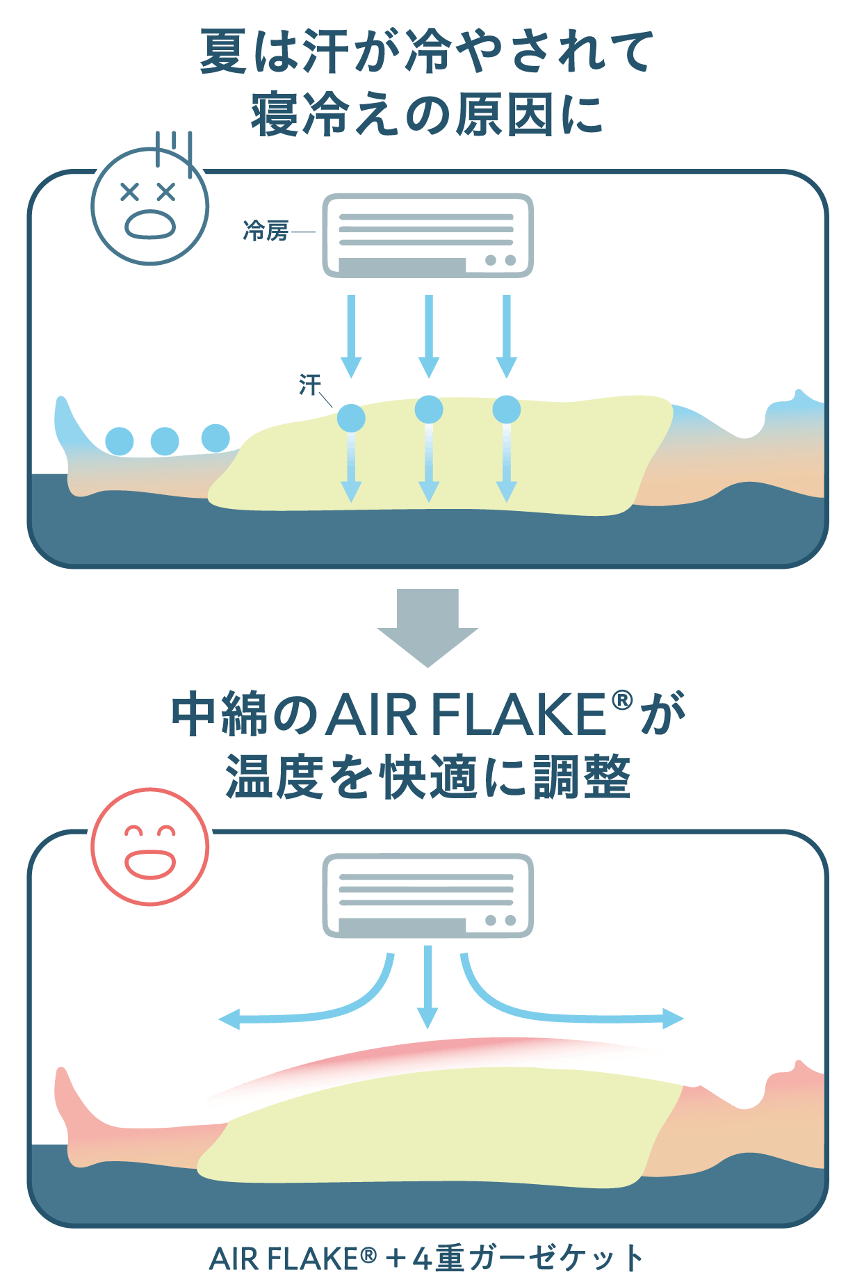 夏の寝冷えは、汗や水分が冷やされることで起こります。中綿のAIR FLAKE®️が、外側から冷やされることを防ぎ、また内側で快適に温度を維持してくれます。