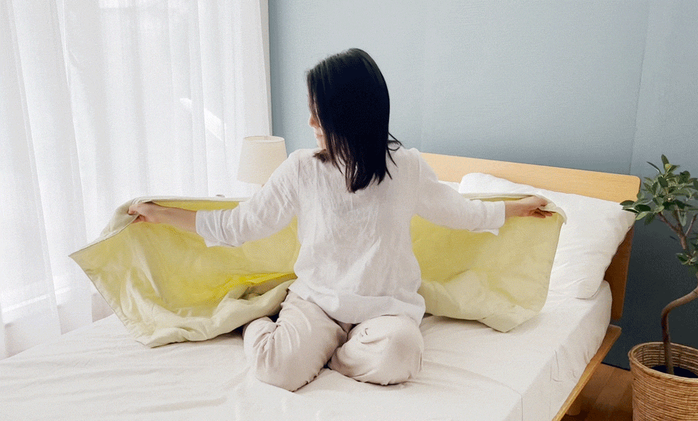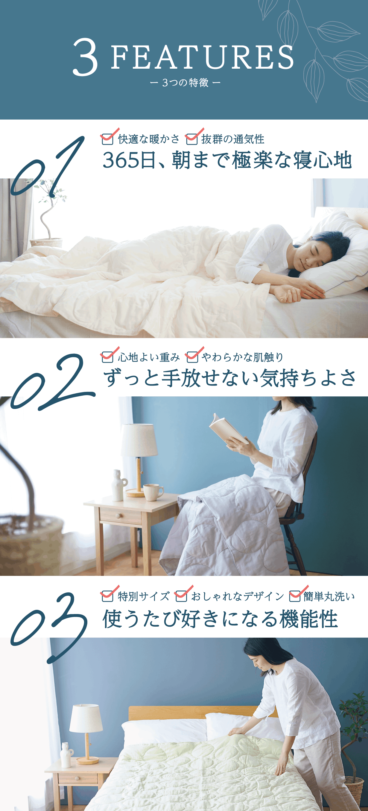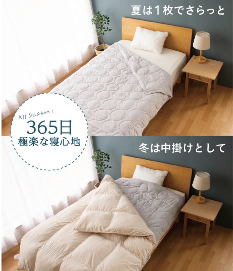 【秋冬】も羽毛布団の中掛けとして使用することで、いつもの羽毛布団がパワーアップ!肌触りもやわらかで気持ちよく、365日あなたの睡眠にやさしく寄り添います。