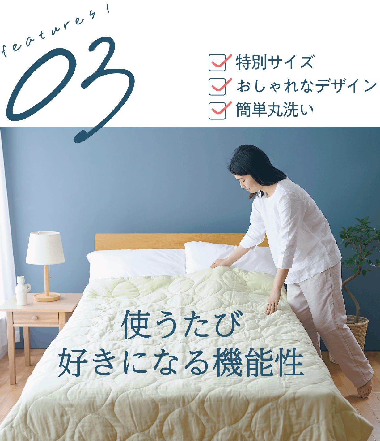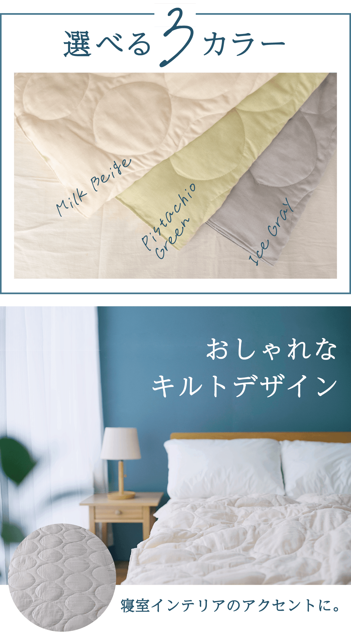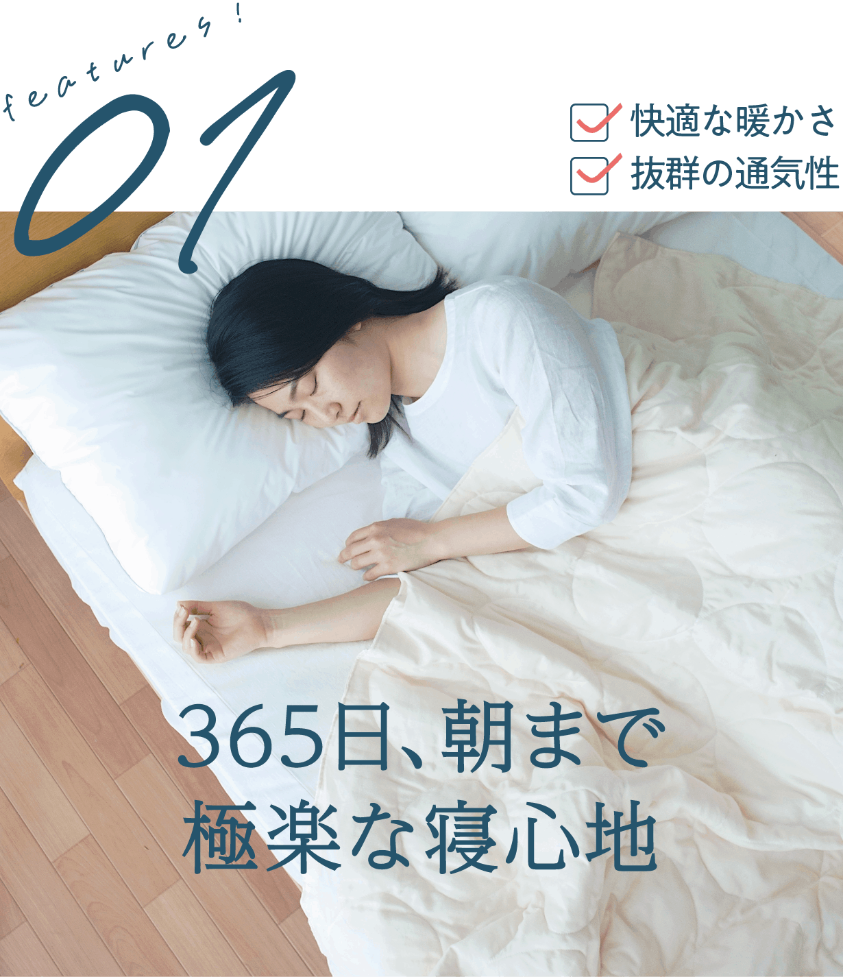 【秋冬】も羽毛布団の中掛けとして使用することで、いつもの羽毛布団がパワーアップ!肌触りもやわらかで気持ちよく、365日あなたの睡眠にやさしく寄り添います。