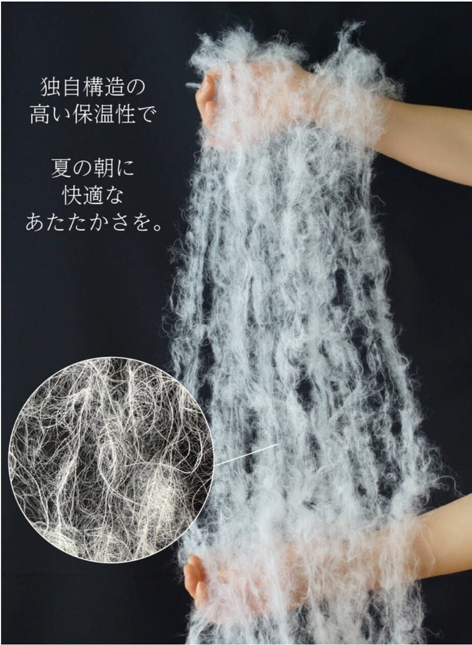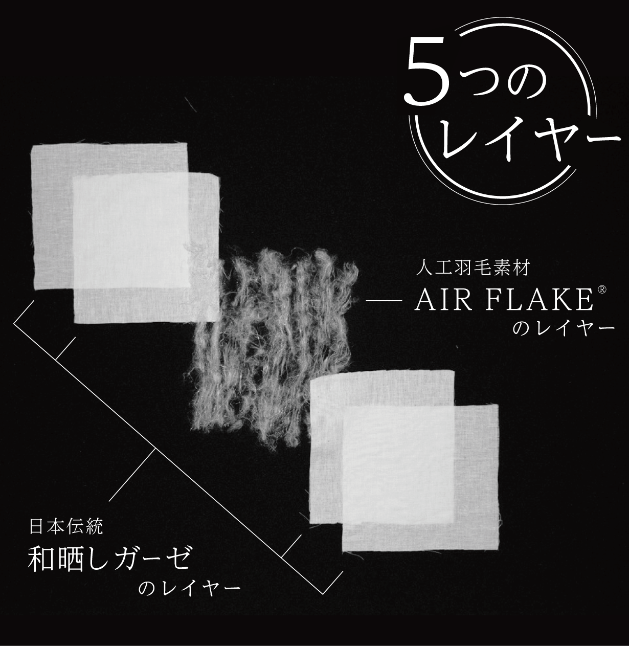 極楽5層ガーゼケットは、日本の伝統的な織物加工技術で作られた天然素材「和晒しガーゼ」と、最新のサステナブル人工羽毛素材「AIR FLAKE®︎」を掛け合わせた5つのレイヤー構造になっています。