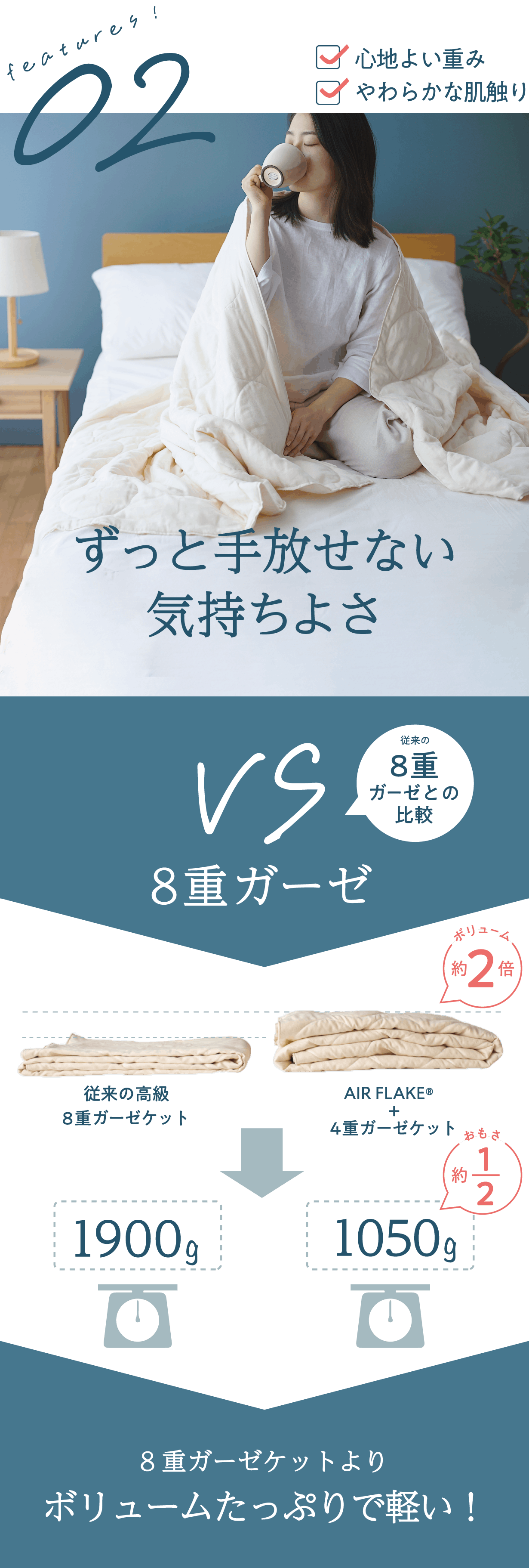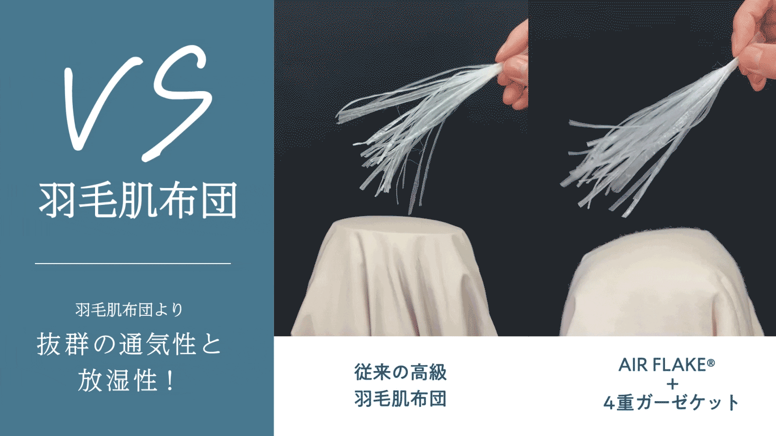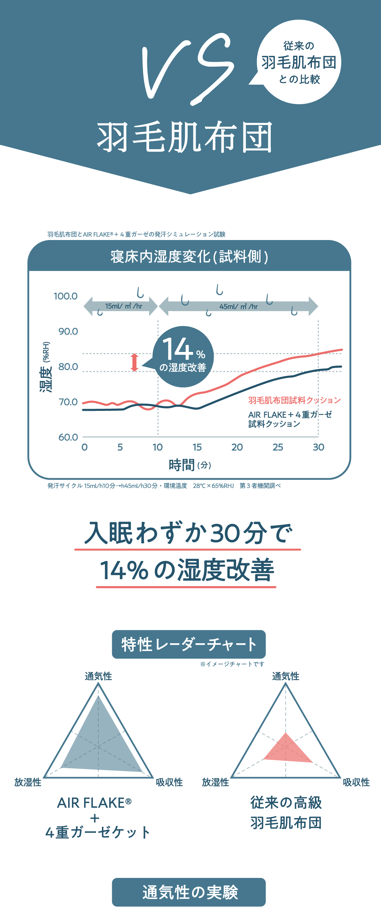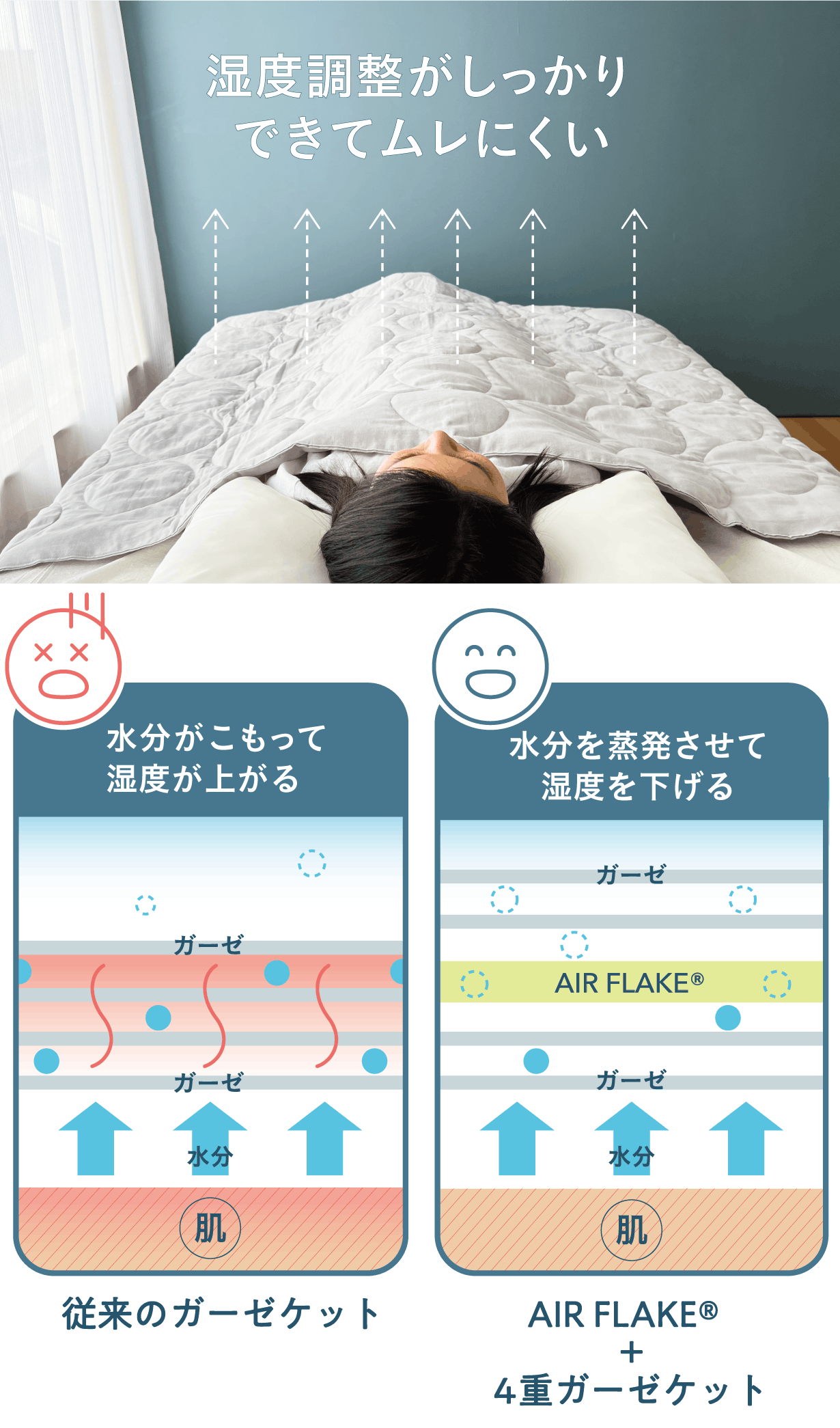 AIR FLAKE®︎+4重ガーゼにしたことで、従来のガーゼケットよりもムレの原因である湿度を下げてくれます。