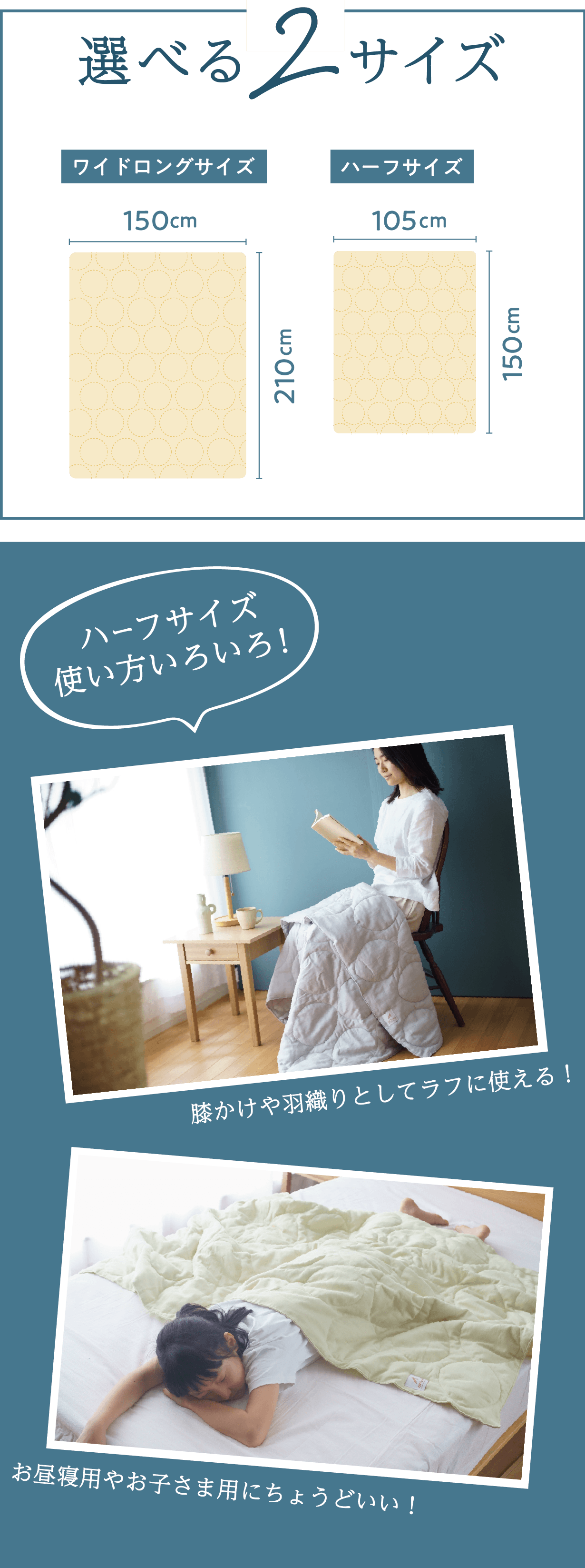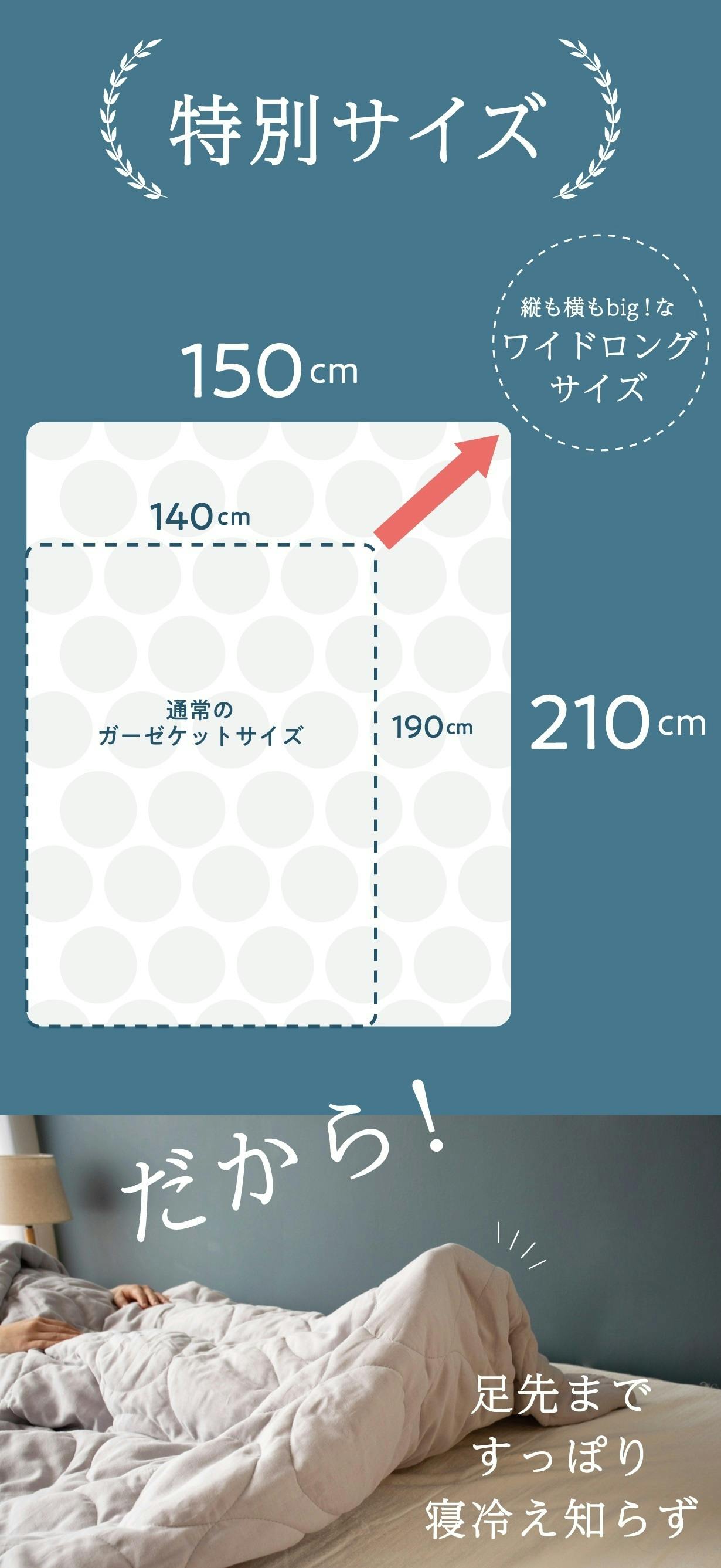またこの極楽5層ガーゼケットは、特別なワイドロングサイズなので、足まですっぽりおさまり、足元が冷やされる心配はありません。