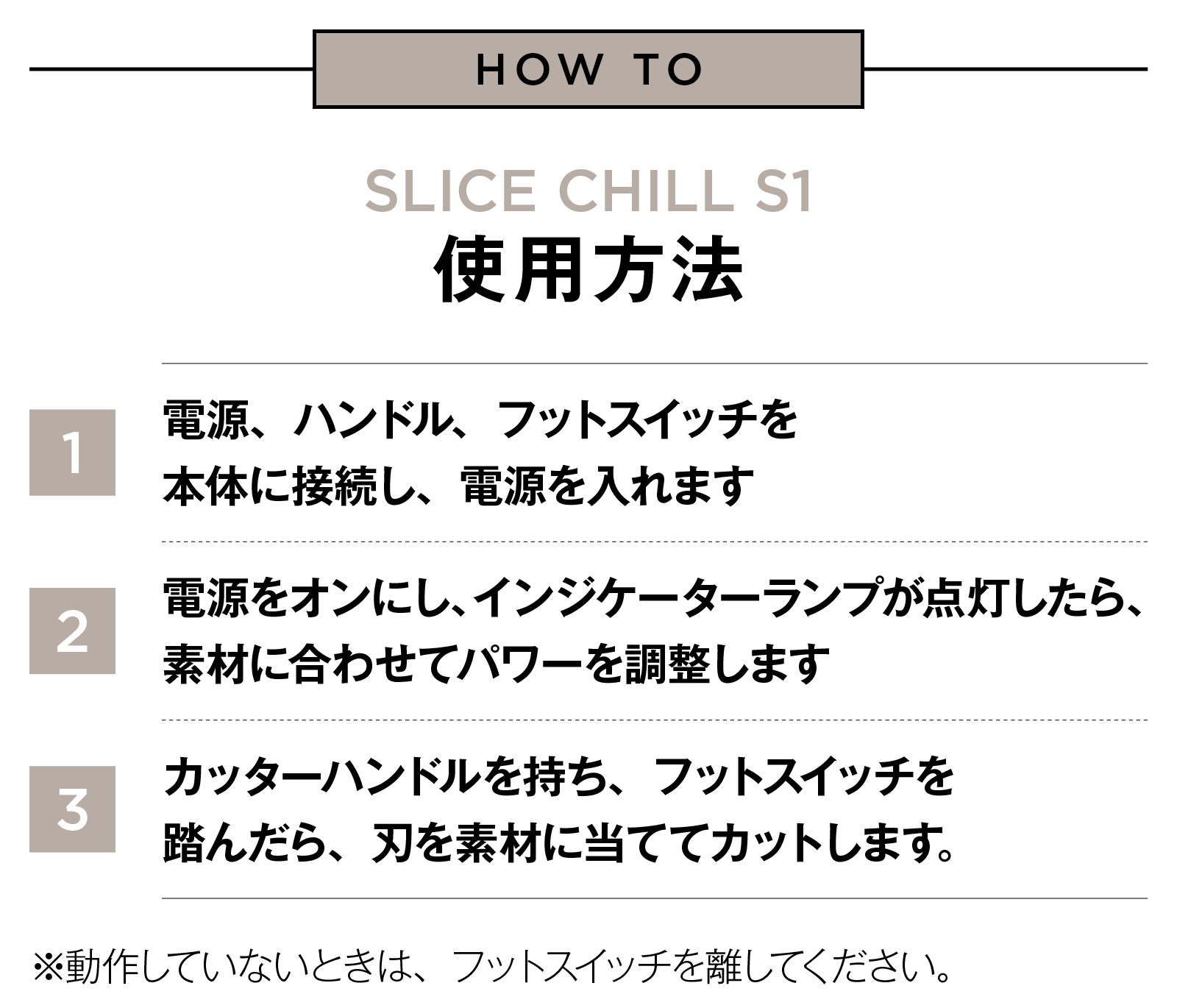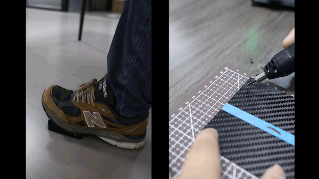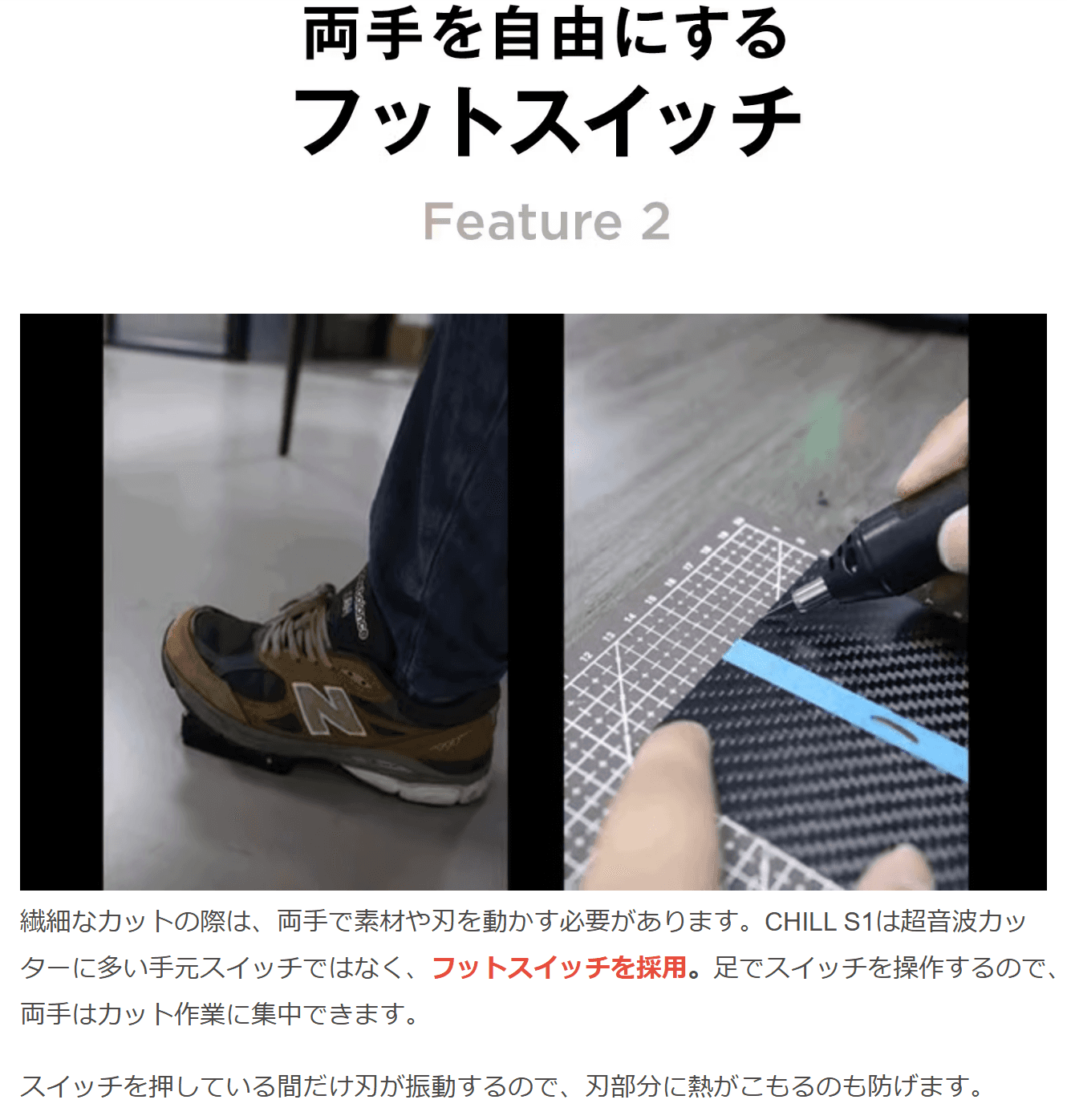 CHILL S1は超音波カッターに多い手元スイッチではなく、フットスイッチを採用。足でスイッチを操作するので、両手はカット作業に集中できます。