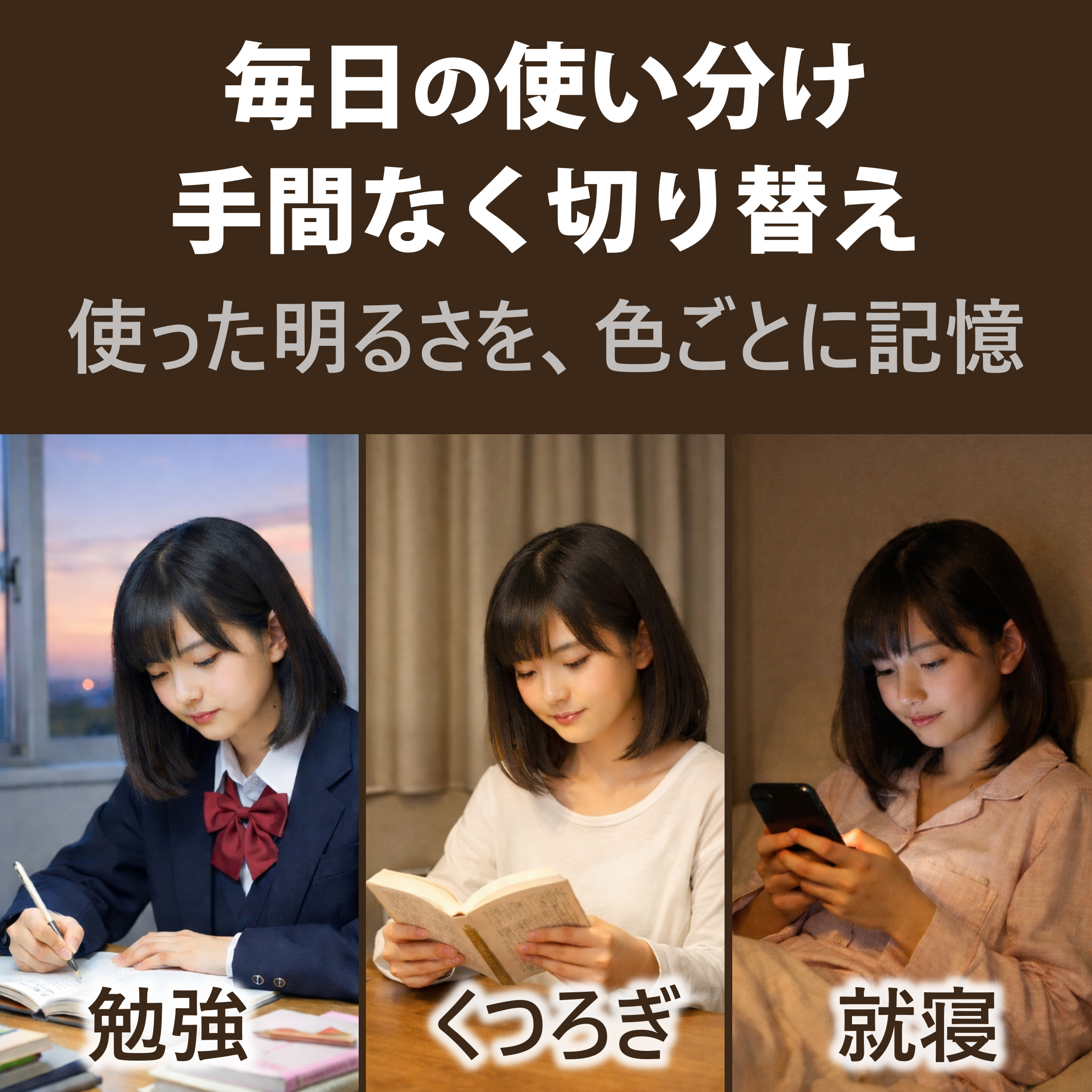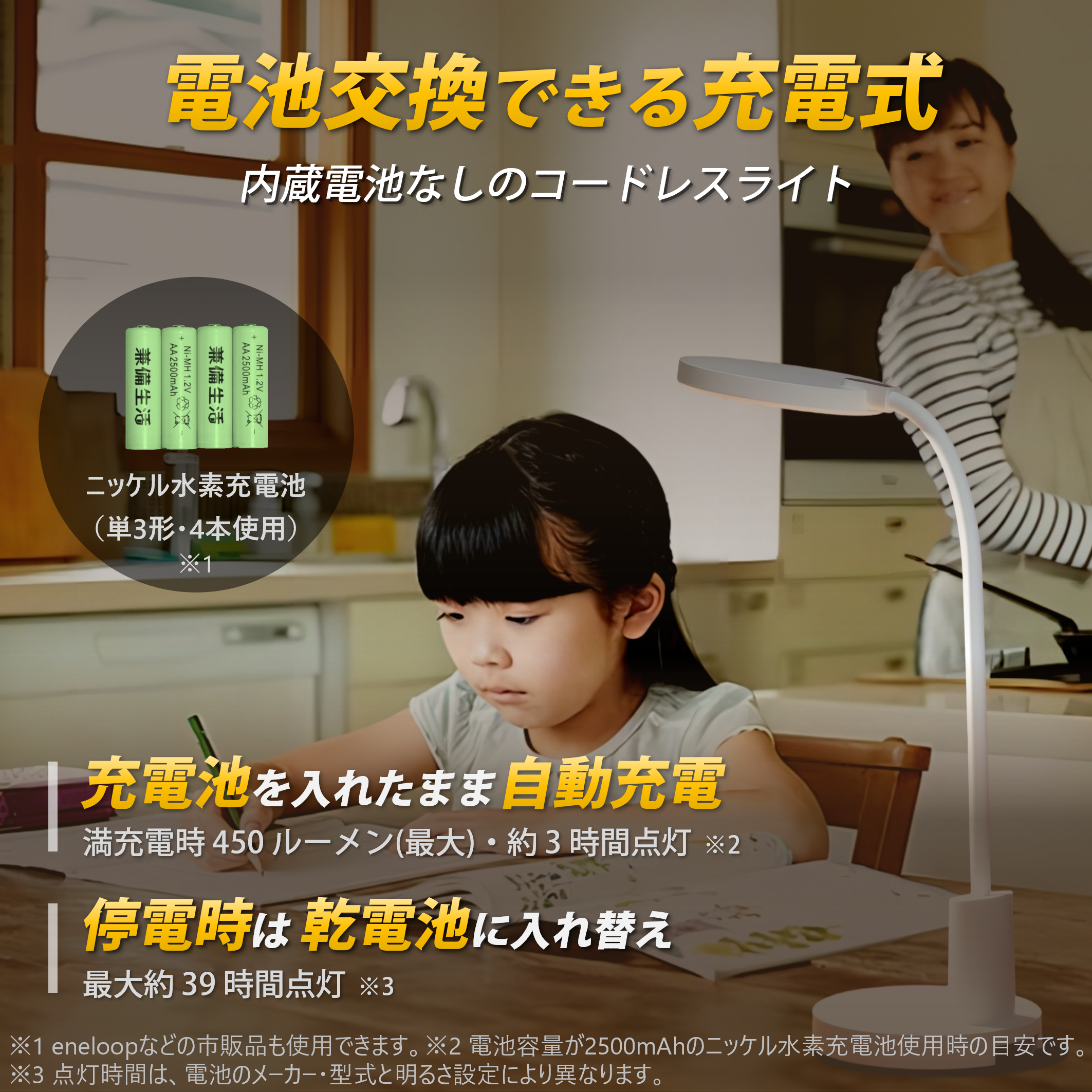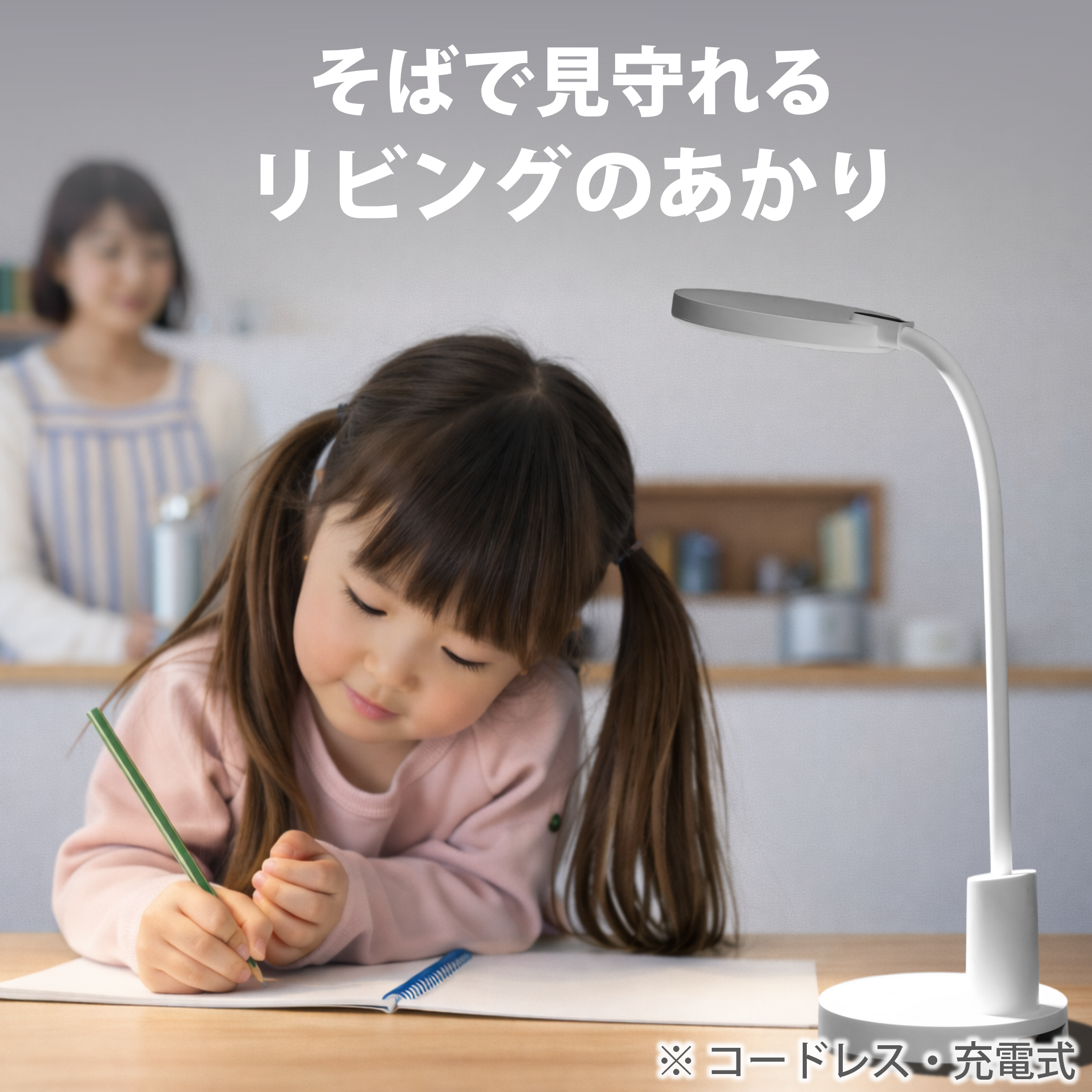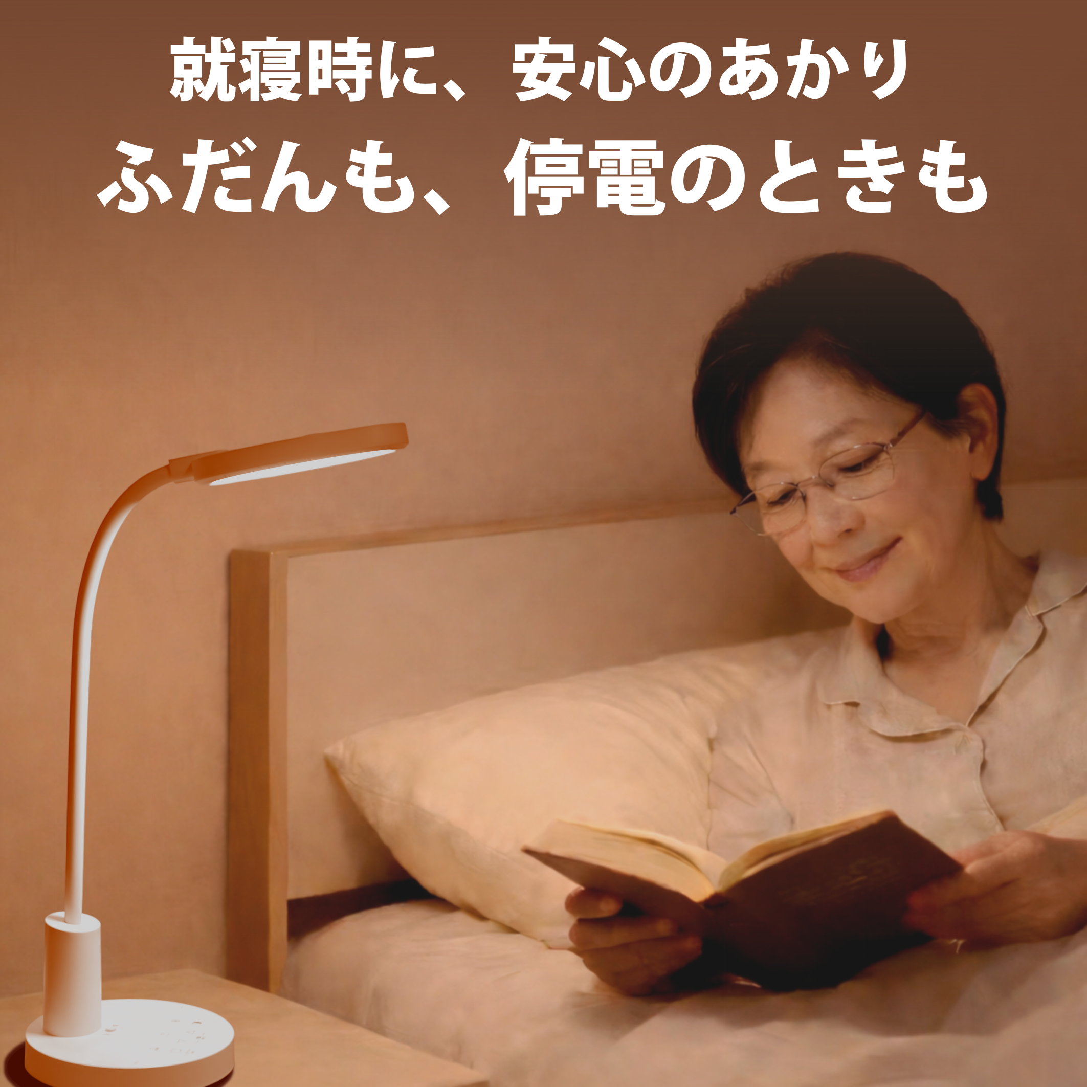 二刀流デスクライトは、ふだんは目にやさしい高品質なデスクライトとして、そして非常時には、家族のそばを静かに照らす「安心のあかり」として寄り添います。