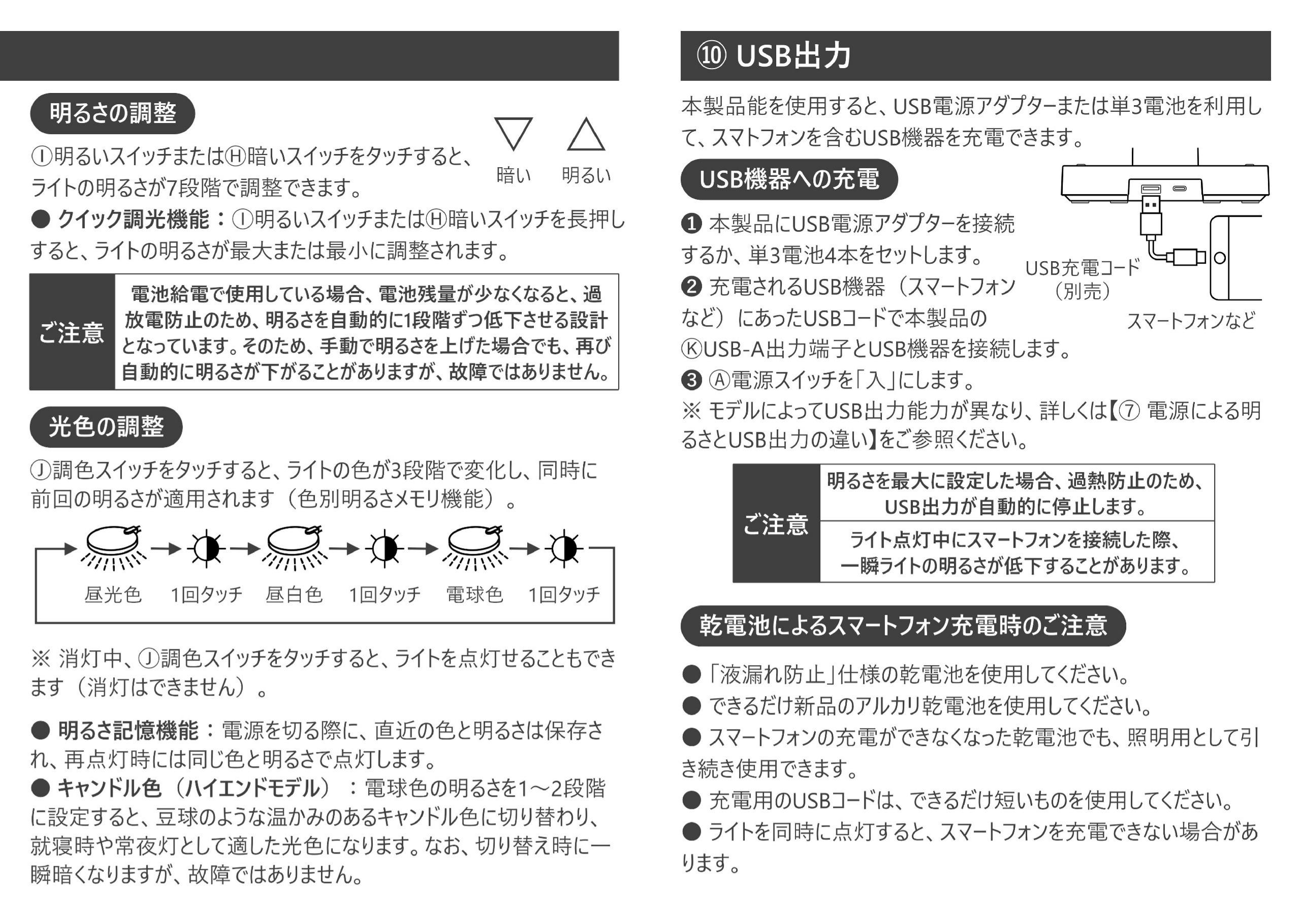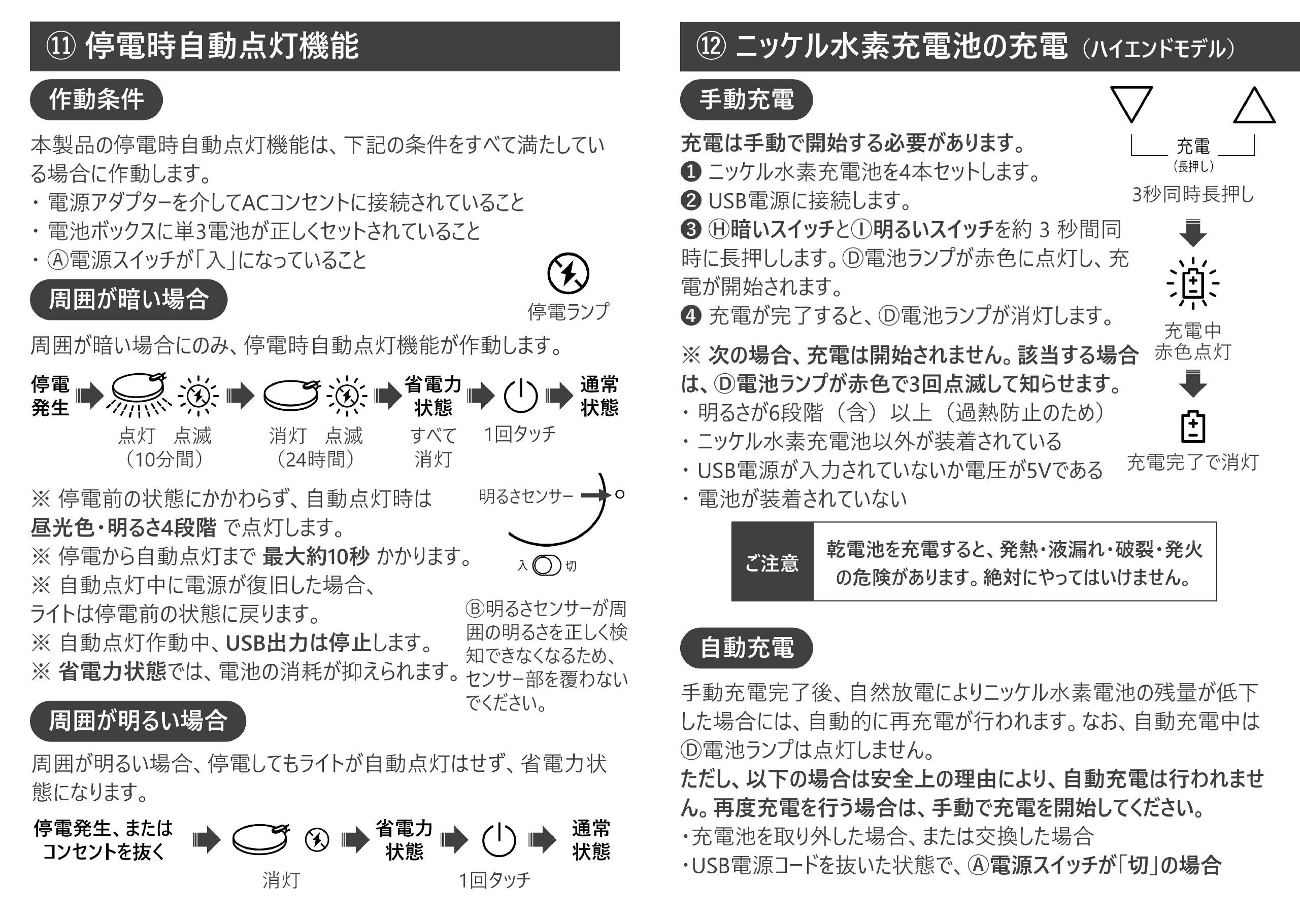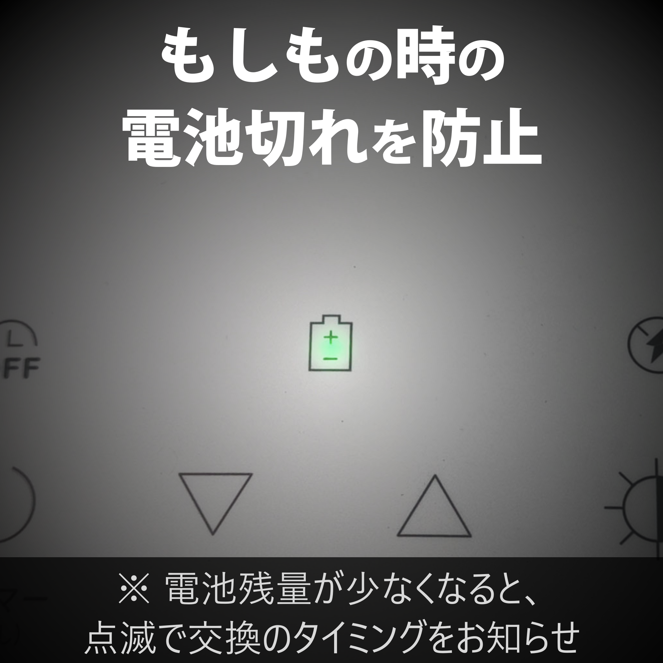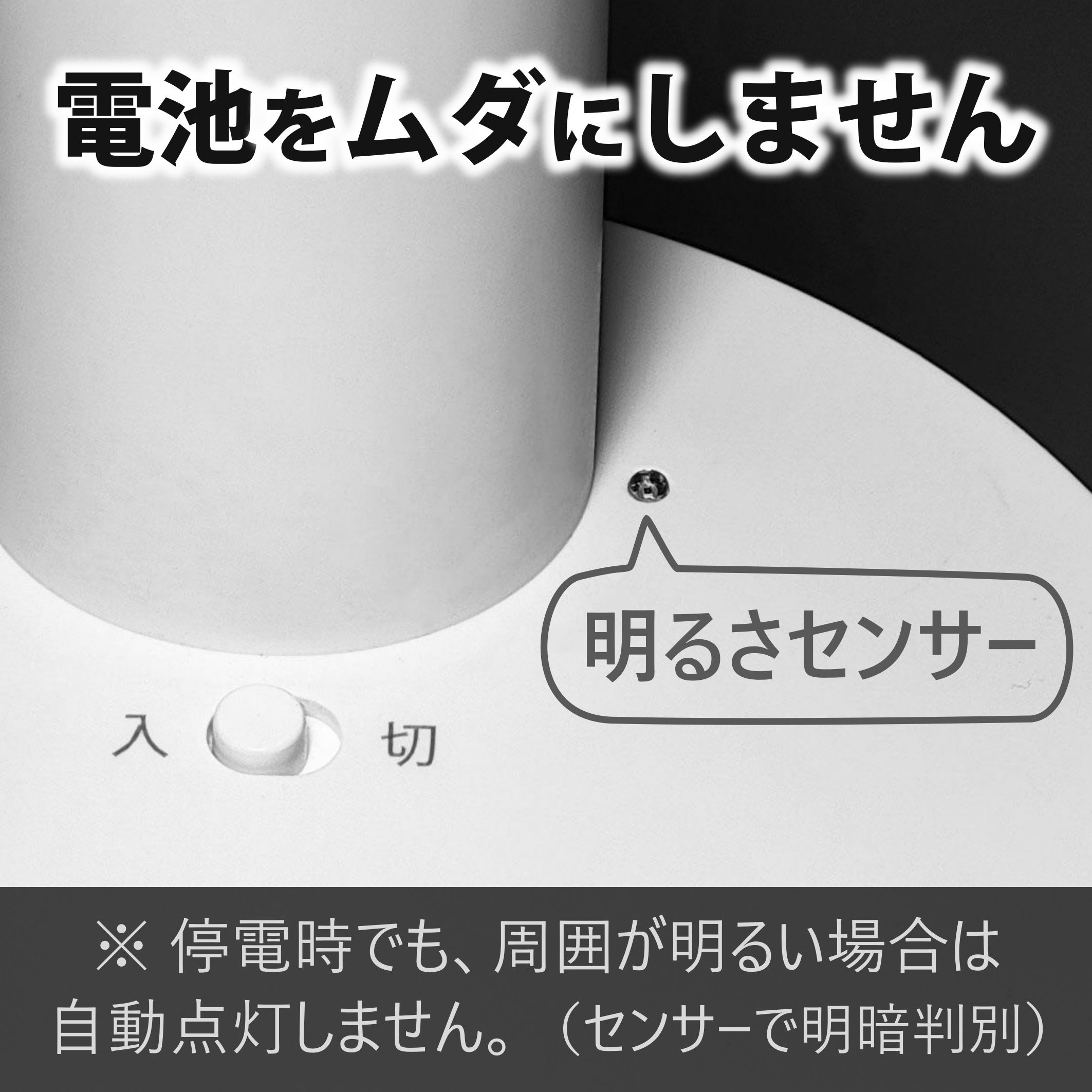 ⇒ 次の条件をすべて満たしている場合、停電が発生するとデスクライトが自動で点灯します。① 停電を検知するため、ACアダプターから給電されていること、② 停電時の電源として単3電池が挿入されていること、③ 周囲が暗いこと(電池消費を抑えるため)。停電時に点灯した場合、ライトは明るさ4段階で約10分間点灯します。その後は消灯し、停電ランプが約24時間点滅して、停電が発生したことをお知らせします。