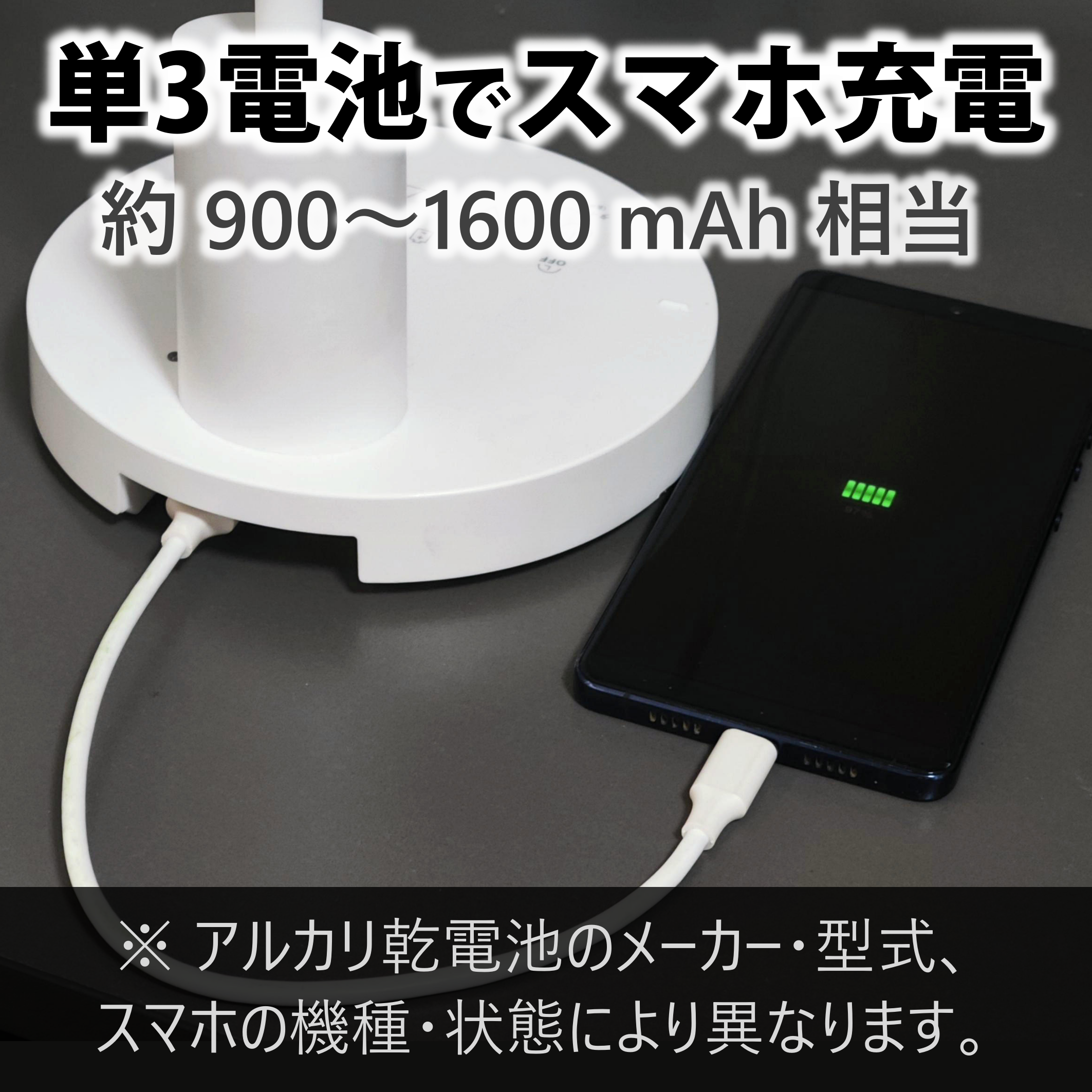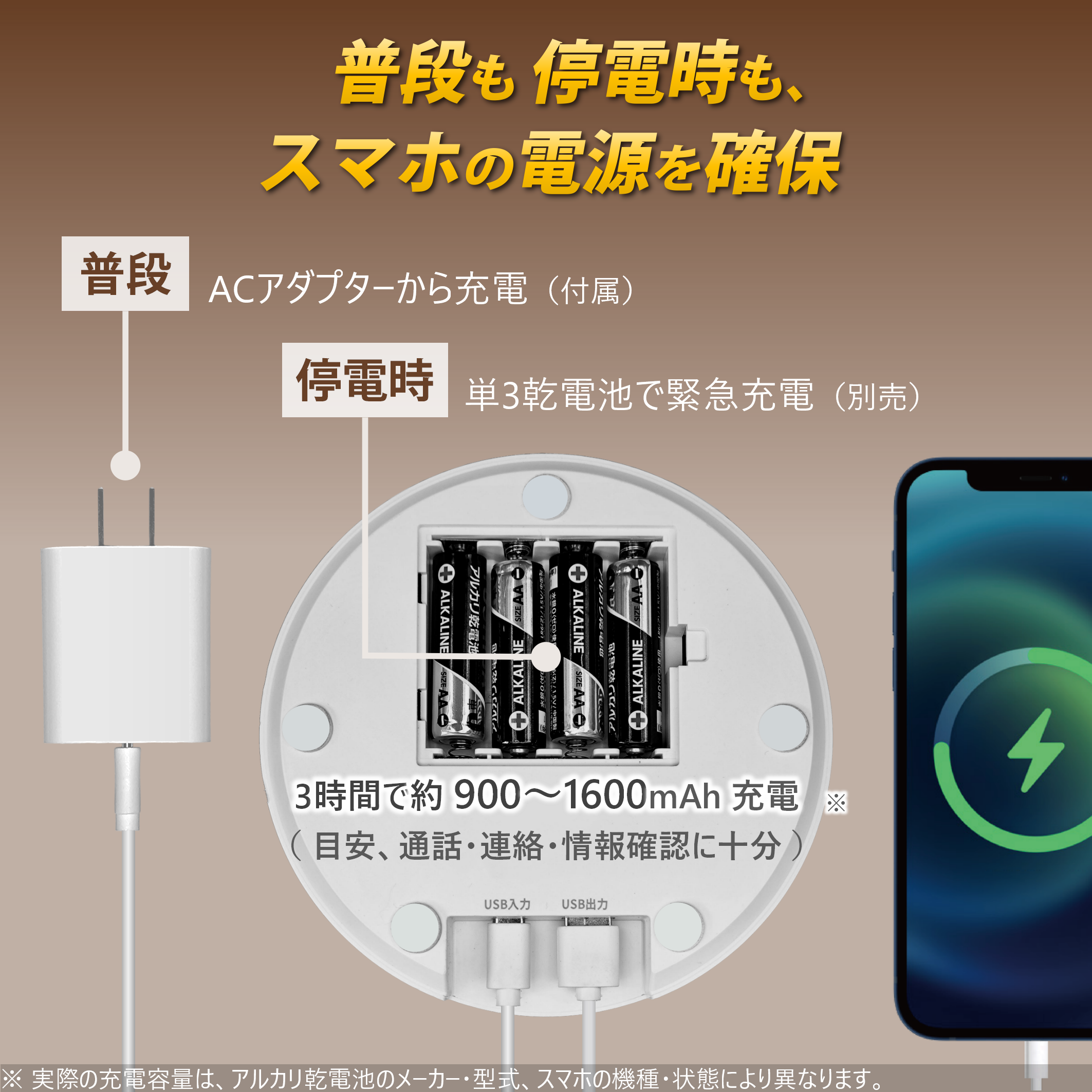 ⇒ スマホをシャットダウンした状態で、目安として約3時間で約900~1600mAhをスマホの内蔵電池に充電できます。実際の充電容量は、乾電池のメーカー・型式やスマホの機種・状態によって異なります。より多く充電するためには、0.5m以下の短いUSBケーブルの使用をおススメします。また、充電ケーブルは備蓄用の乾電池と一緒に保管しておくと安心です。スマホの充電ができなくなった乾電池でも、まだ照明に使える電力が残っています。新しい乾電池はまずスマホの充電に使い、充電できなくなったら照明に使うことで、効率よく乾電池を使い切ることができます。