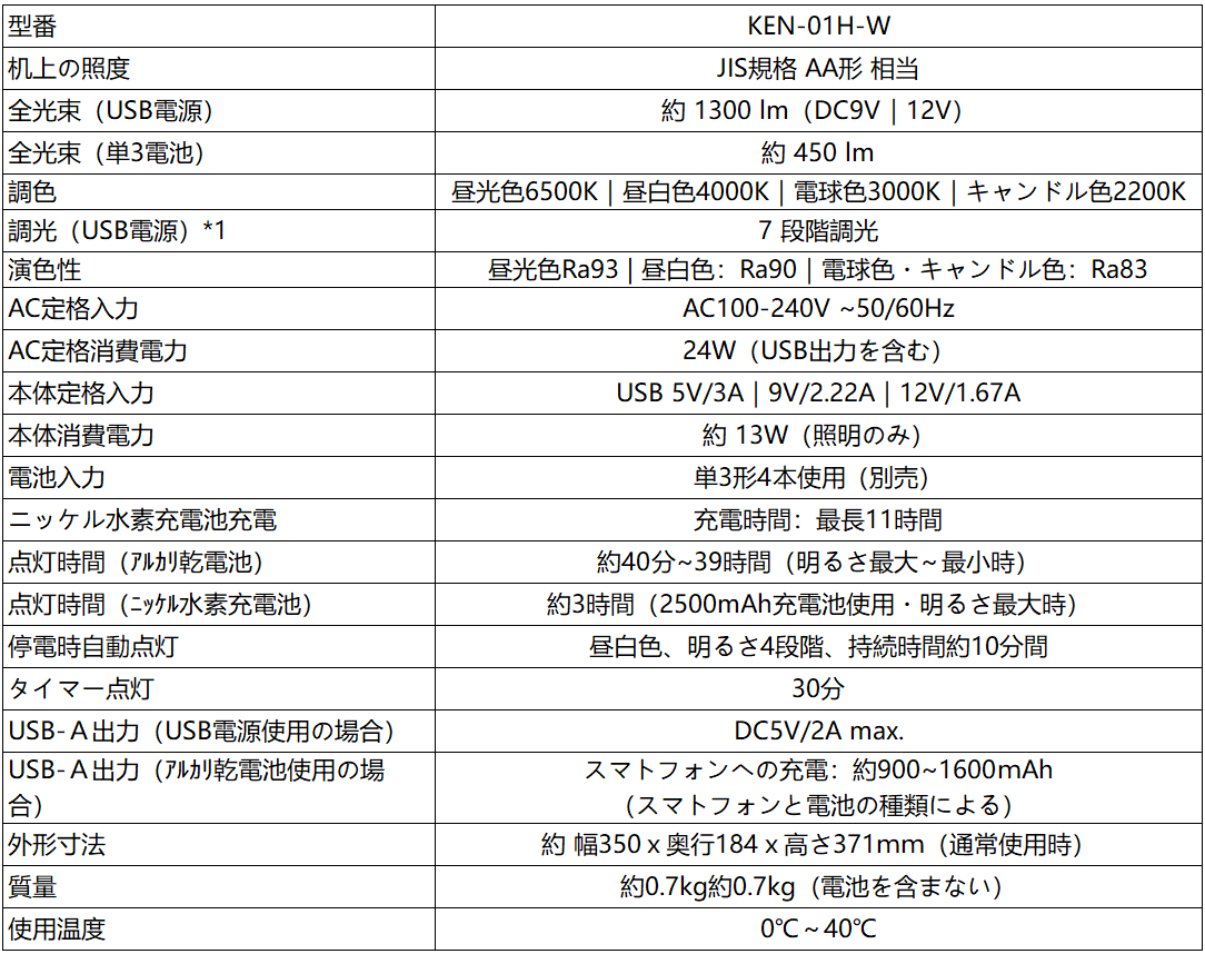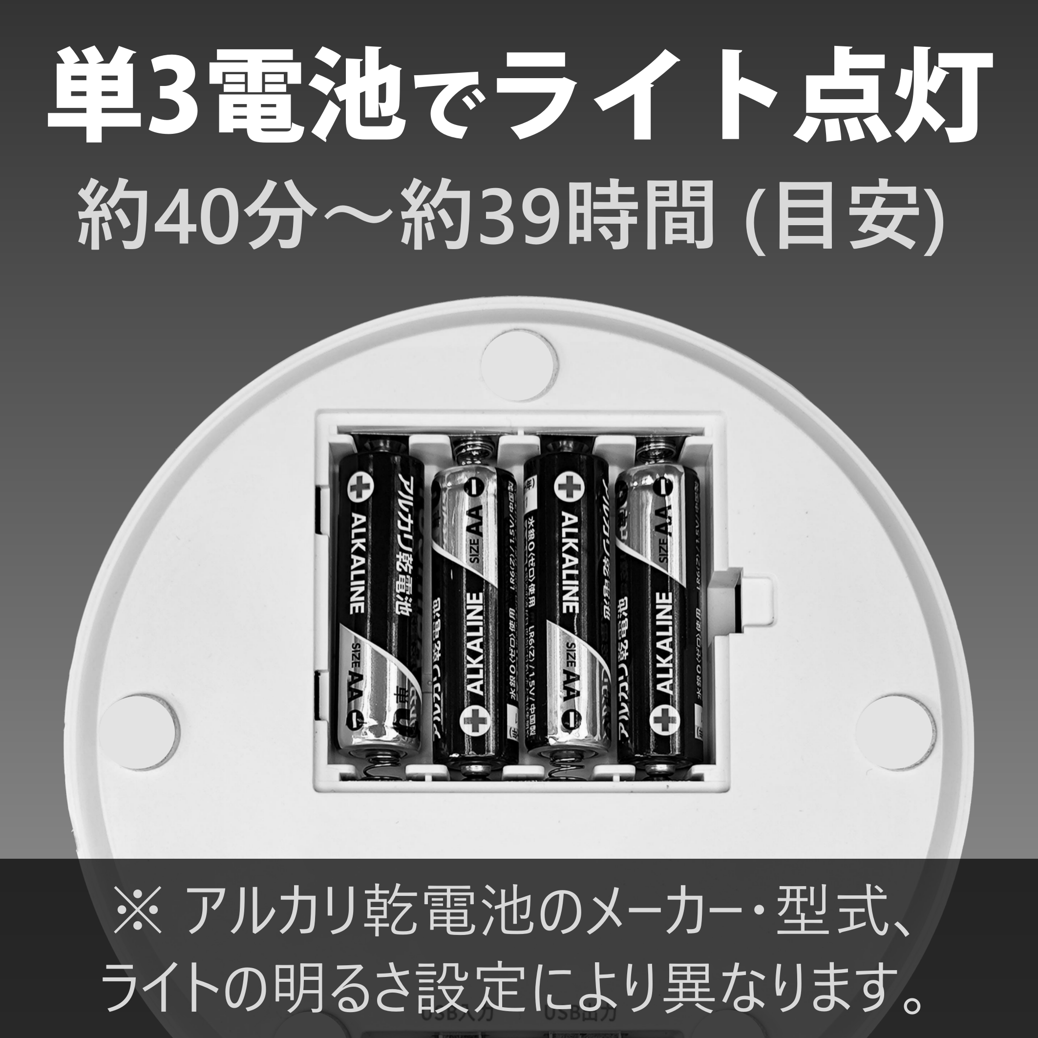 ⇒ アルカリ乾電池使用時の点灯時間は、明るさ7段階で約40分、1段階で約39時間です。なお、電池のメーカーや型式、明るさ設定によって点灯時間は異なります。また、容量2500mAhのニッケル水素充電池を満充電した場合、明るさ7段階で約3時間点灯します。