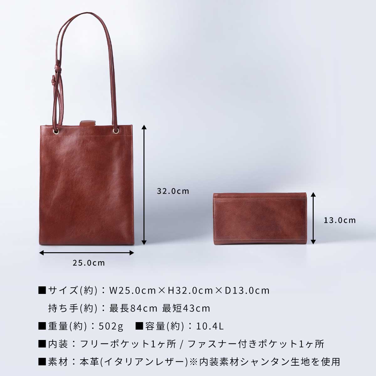 横型トートにありがちな、周囲への配慮という無意識のストレスからあなたを解放します。身体の幅にぴたりと収まる設計は、混雑した通勤電車や人混みでも驚くほど身軽。さらに、13cmの絶妙なマチ幅を確保することで、スリムな見た目からは想像できない10.4リットルの大容量を実現しました。