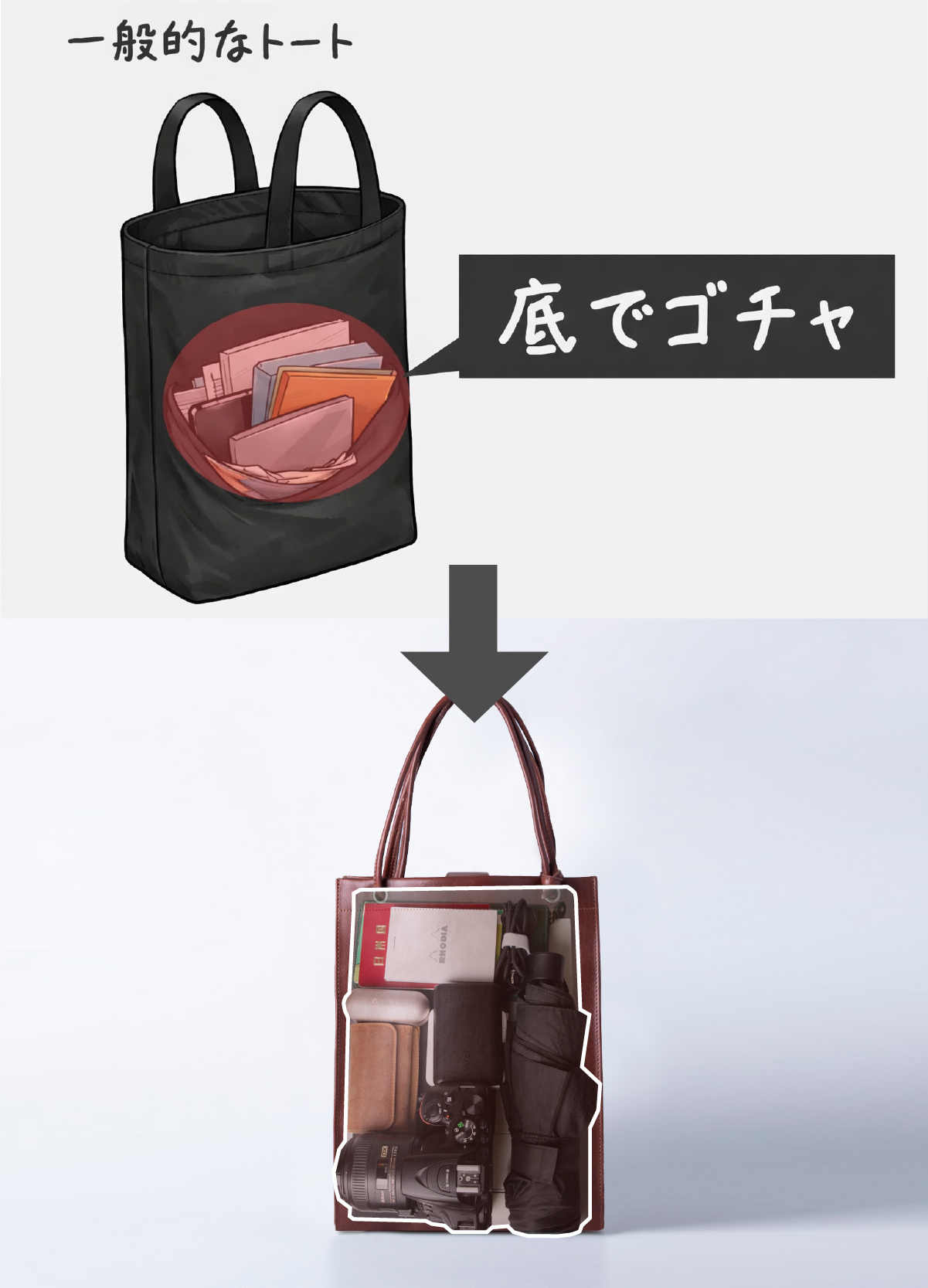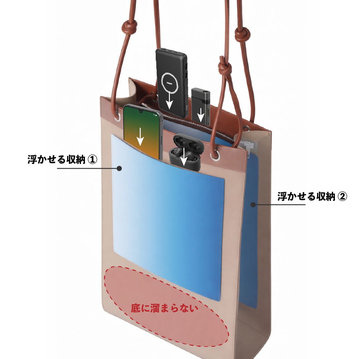 縦型バッグ最大の弱点、それは「荷物が底に溜まり、小物が行方不明になること」でした。「Tatet」はこの課題に対し、両サイドに配置した「浮かせる収納」で答えを出しました。