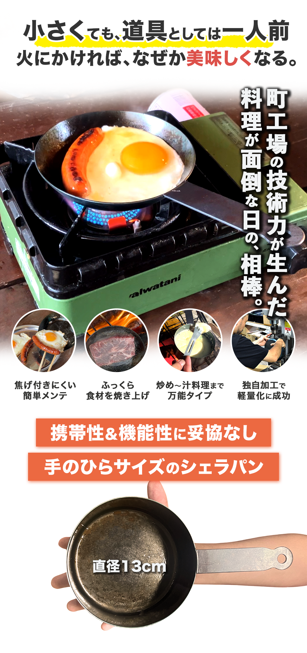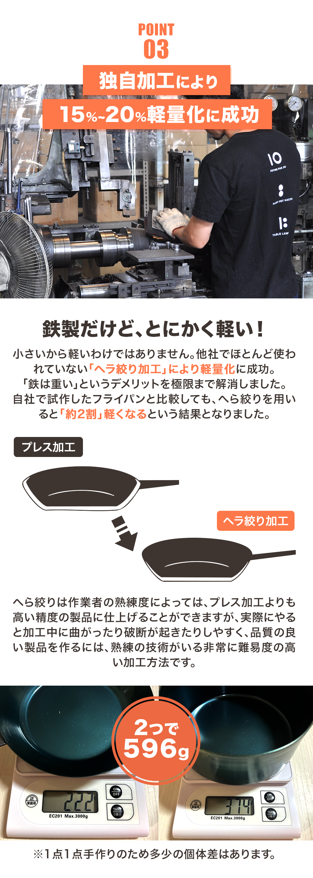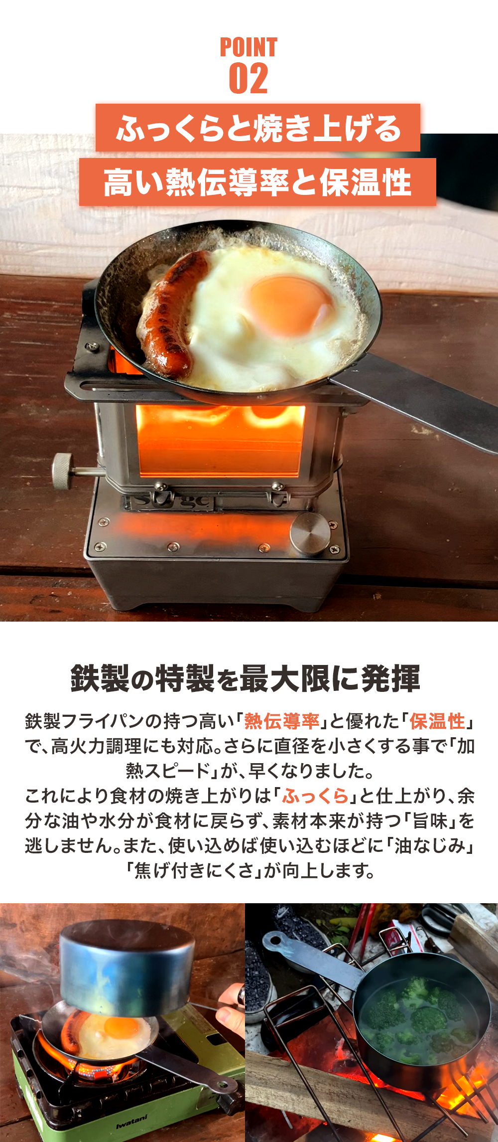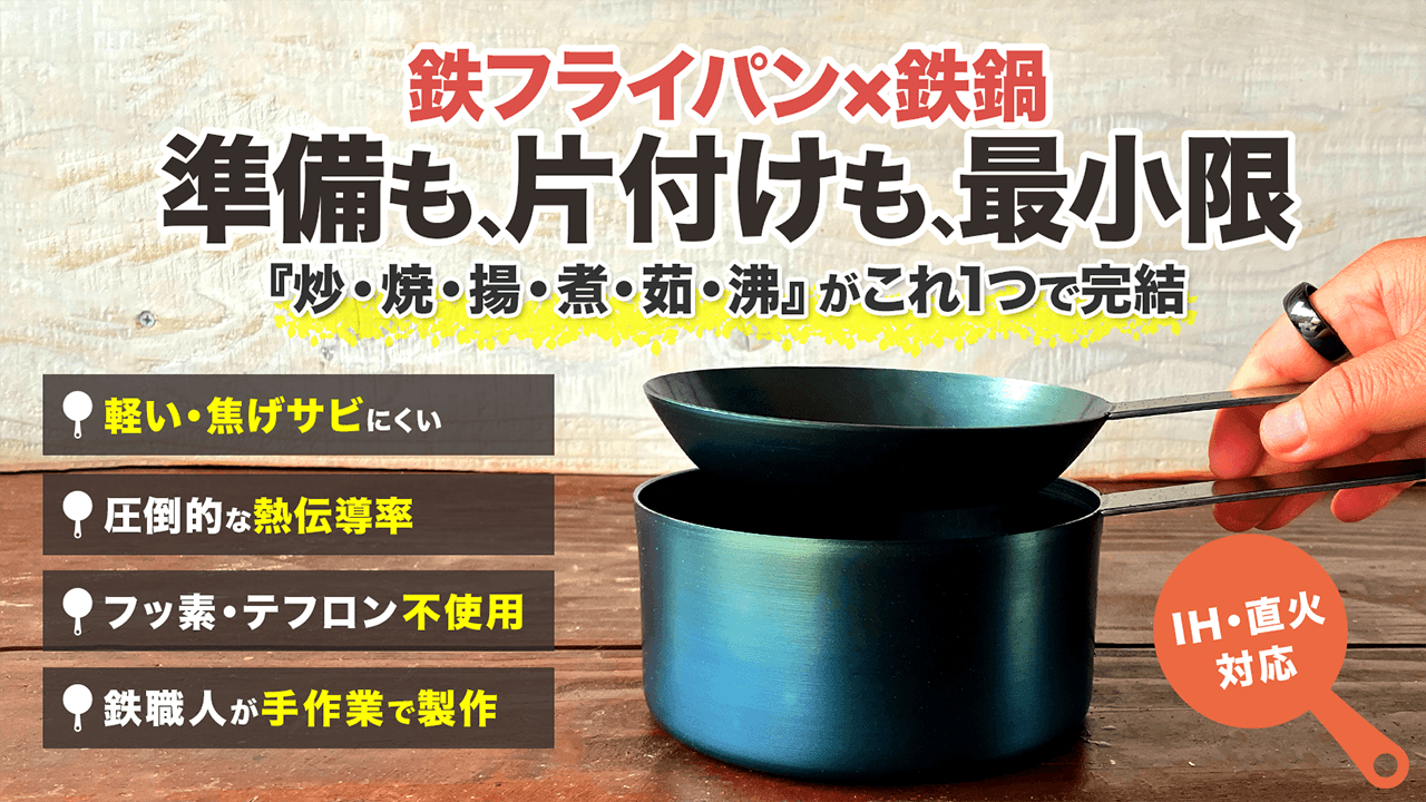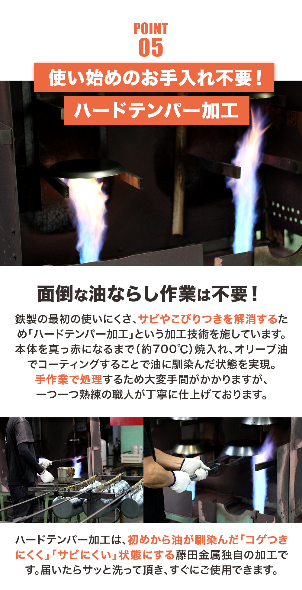 ※1:ハードテンパー加工は、鉄本来の難点を改善した「こげつきにくく・サビにくい」加工方法で、本体が真っ赤になるぐらい焼き入れて本体に油を馴染ませています。
