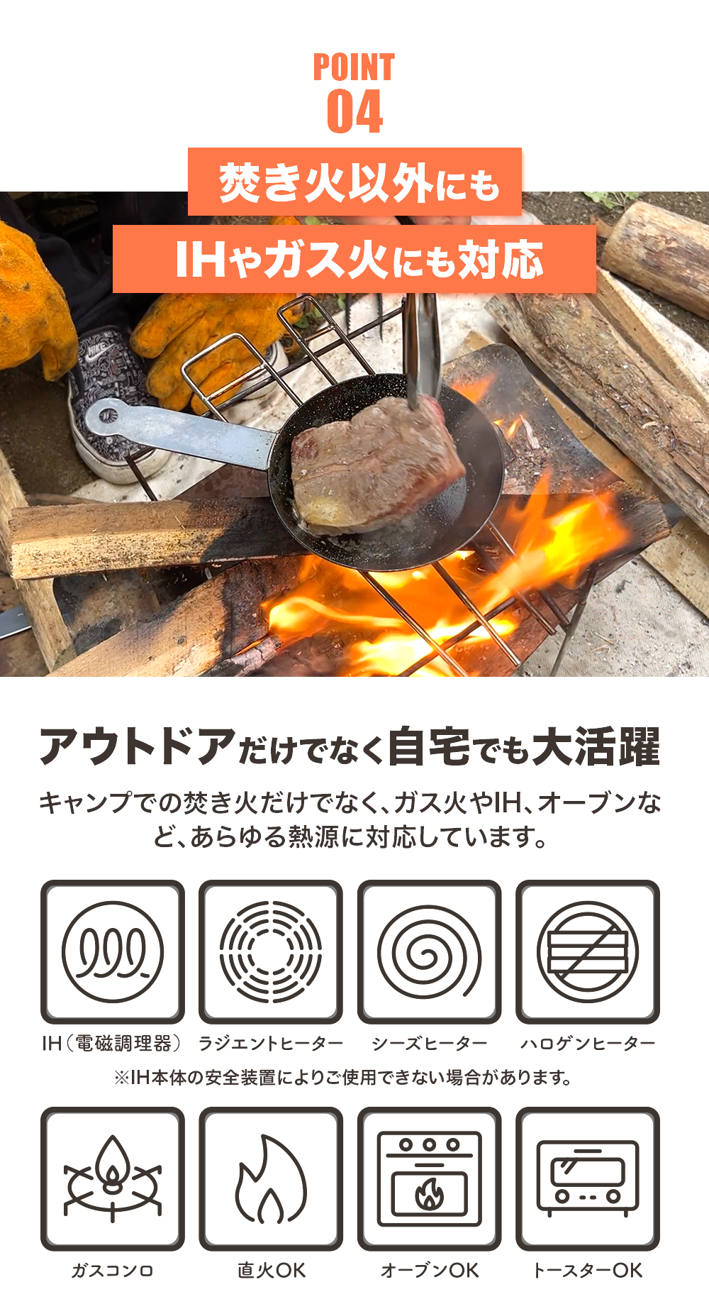 対応熱源:ガス火、IHコンロ(※1)、直火、オーブン、ラジエントヒーターなど