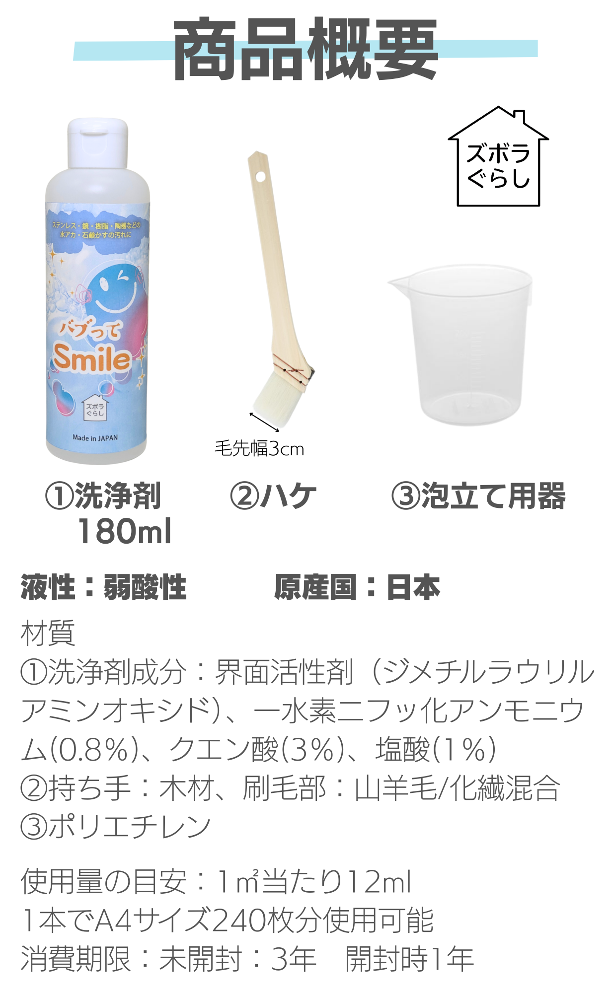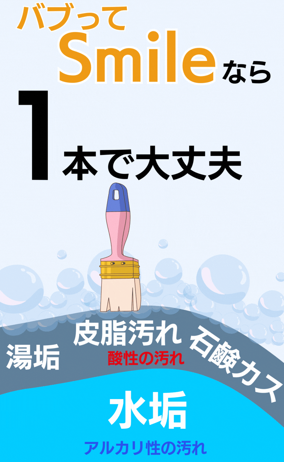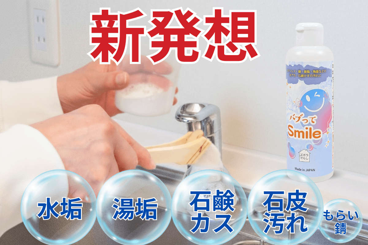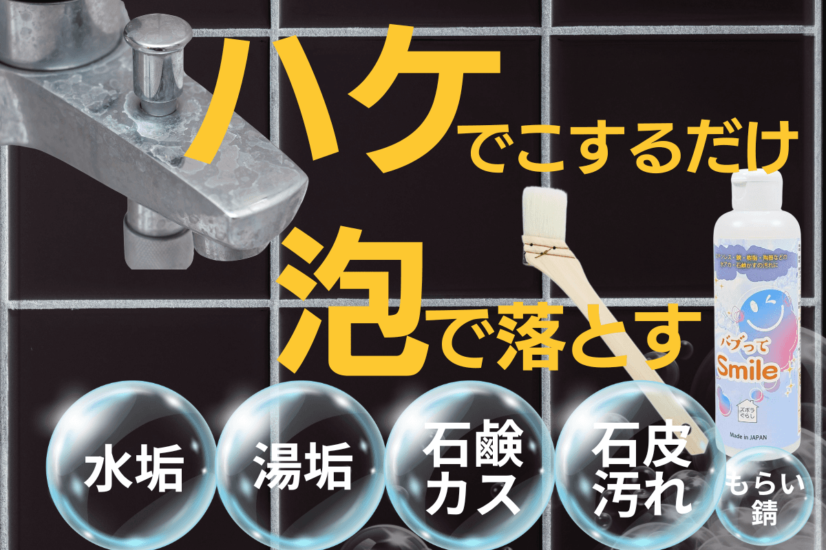 今回ご紹介する「バブってSmile」は日頃からお風呂の汚れに困っていた私がどうにか簡単に手を汚さずに水垢等を落とせないかと考えて企画をしました。隅っこや裏側の汚れにもとどきやすいように「ハケタイプ」で考案をしました プロのお掃除屋さんも納得頂けた洗剤です。