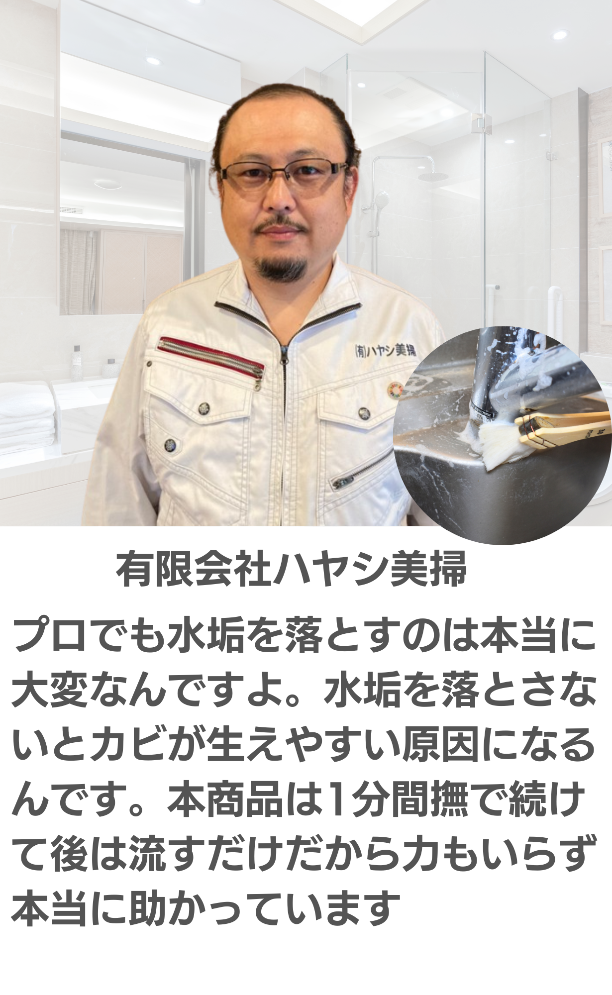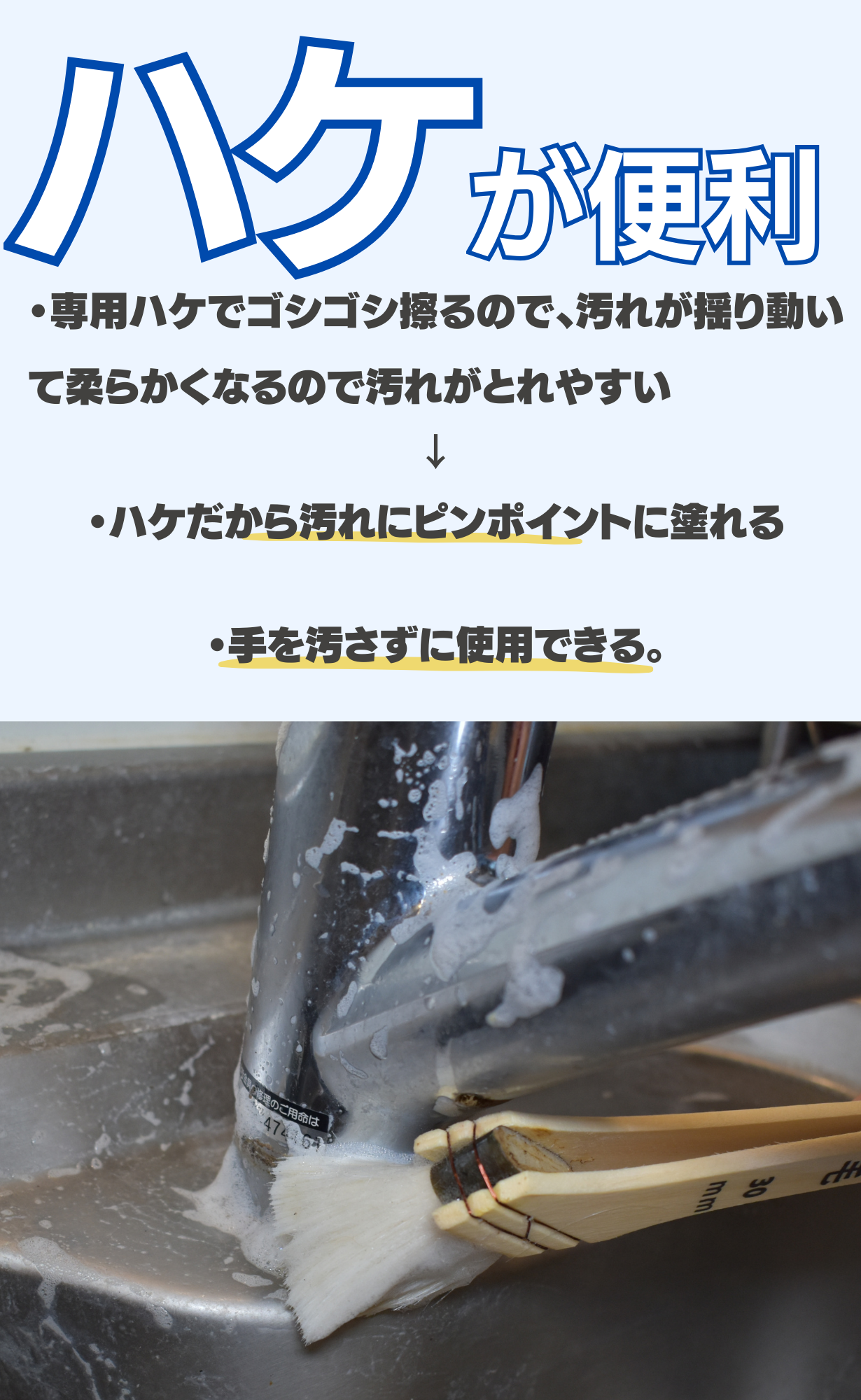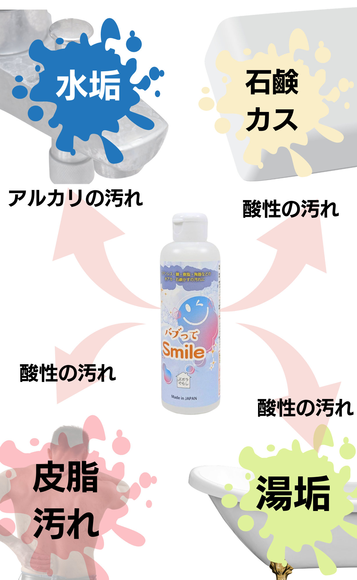 今回ご紹介する「バブってSmile」は日頃からお風呂の汚れに困っていた私がどうにか簡単に手を汚さずに水垢等を落とせないかと考えて企画をしました。隅っこや裏側の汚れにもとどきやすいように「ハケタイプ」で考案をしました プロのお掃除屋さんも納得頂けた洗剤です。