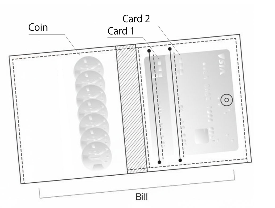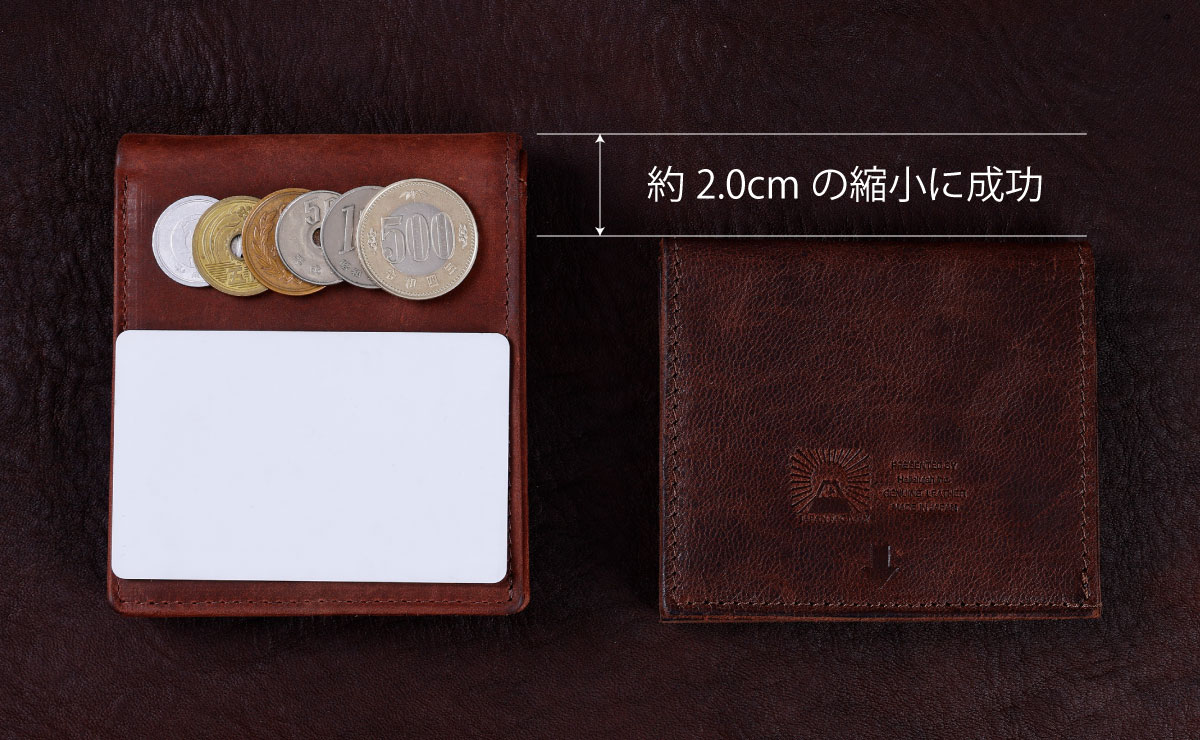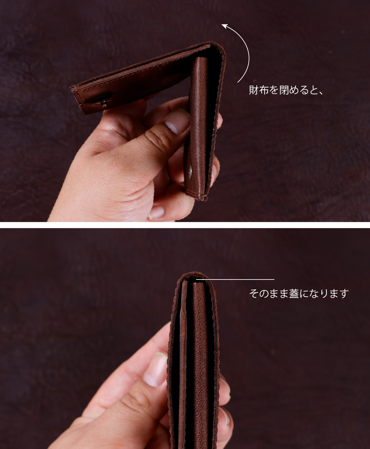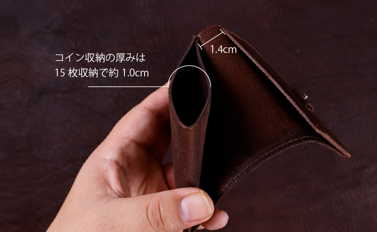計算し尽くされた1.4cmのマージン。その緻密な設計が生んだ「遊び」は、蓋のない自由なアクセスを可能にするだけでなく、折り畳む動作そのものが小銭をロックするシステムとして機能します。財布の厚みを抑えながら、中身の飛び出しを物理的に封じ込める独自の機構を実現しました。