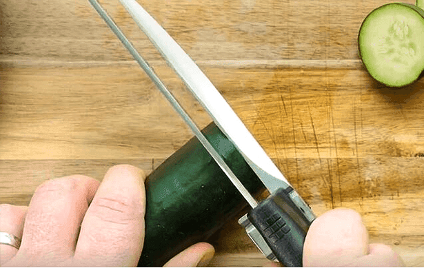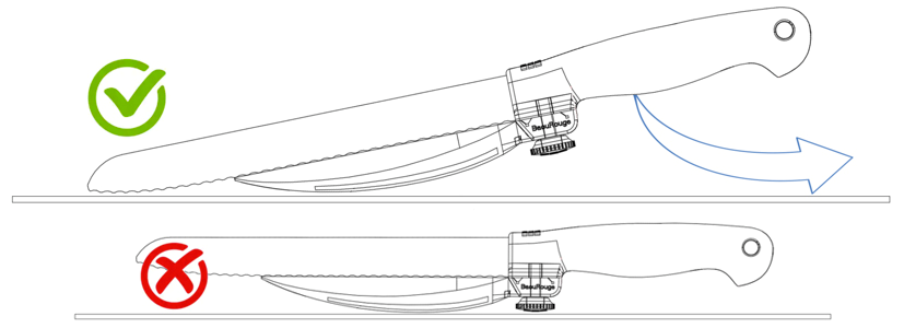刃がまな板まで着いたら、刃を25~45度の角度で立て、その状態をキープしたまま水平に手元まで刃を引いてください。