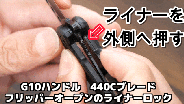 ナイフを閉じるときは、ライナーを外側へ押し、ライナーが外側へ寄ってロックがはずれたと同時に、ブレードの背を押してハンドル方向へ倒します。
