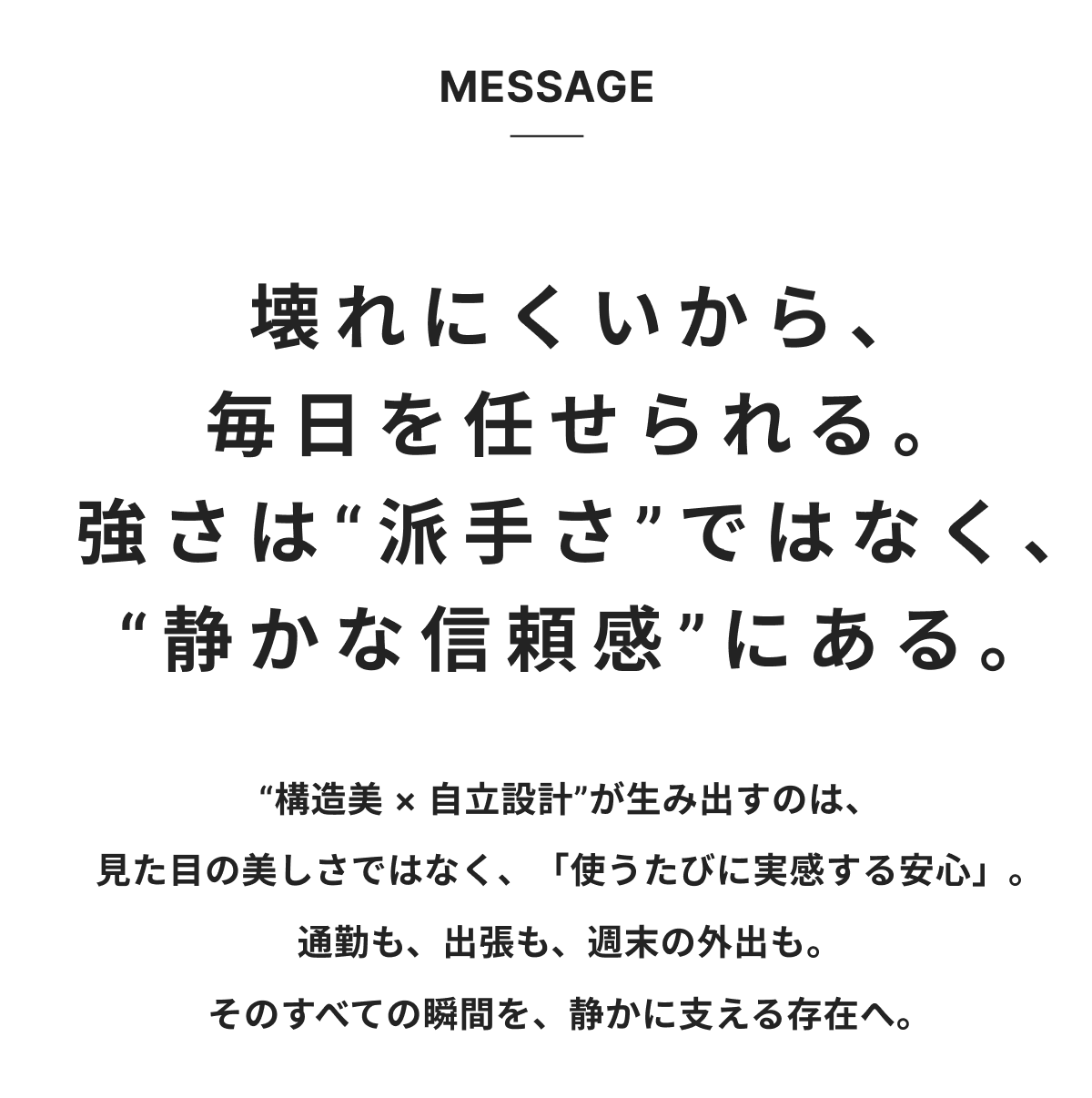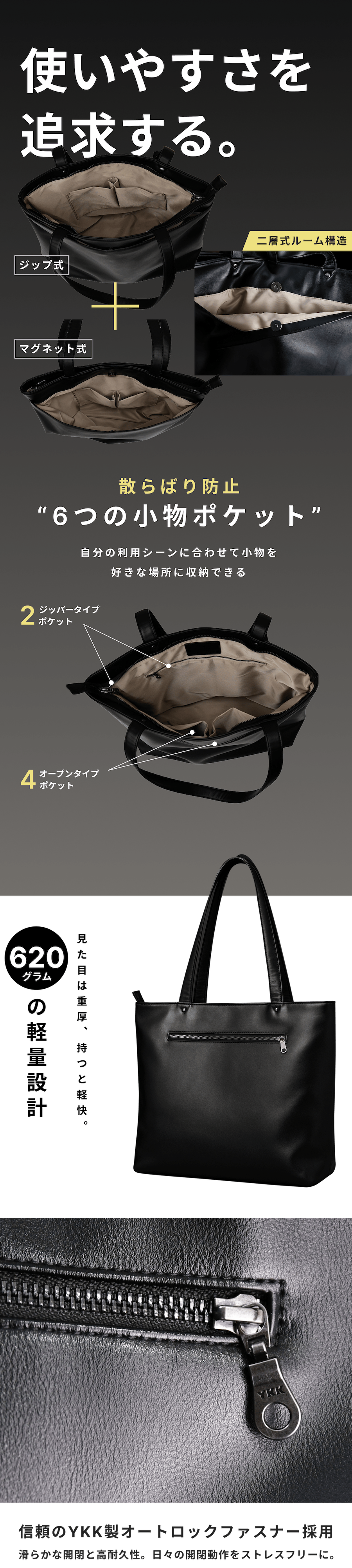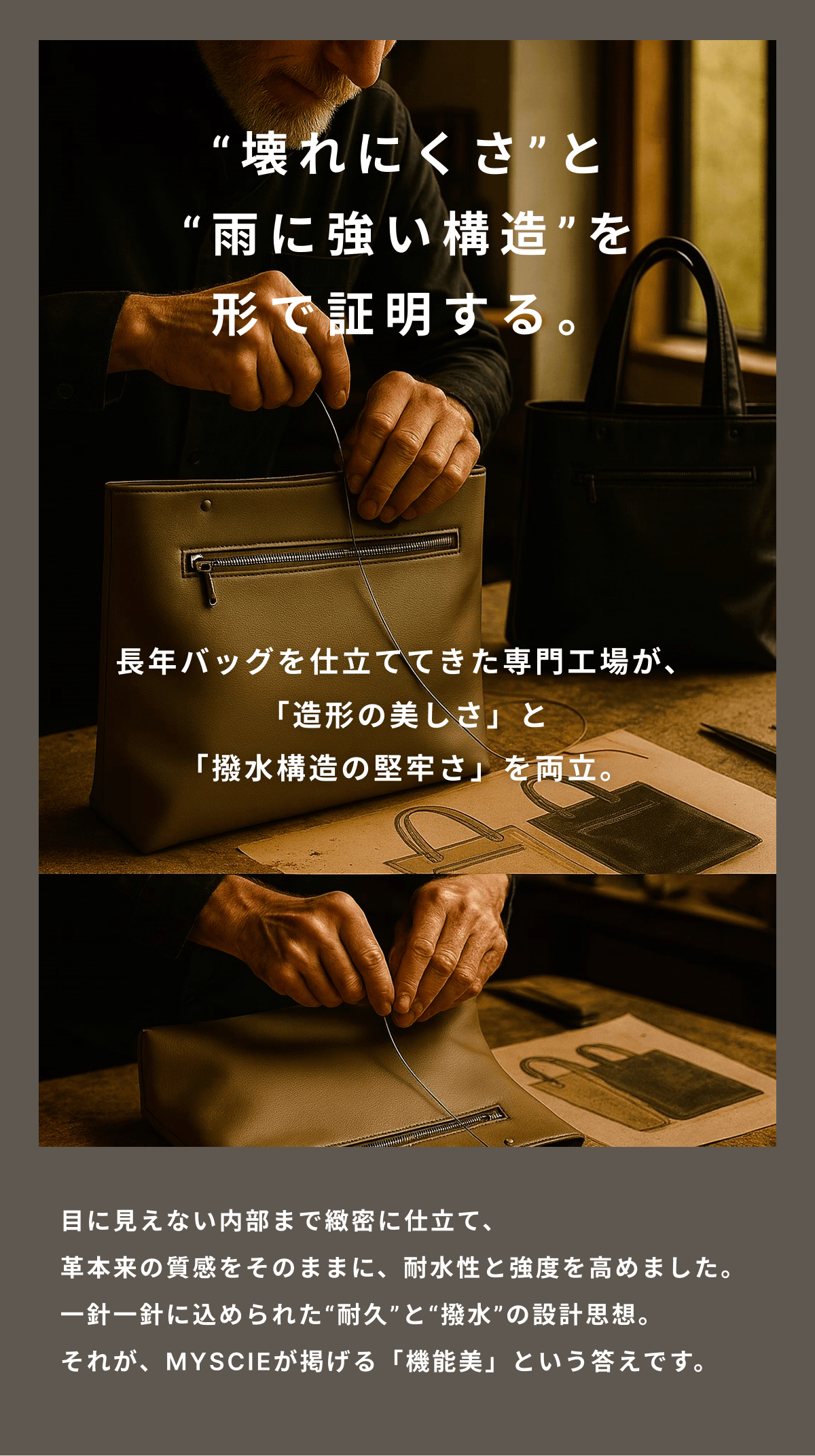 私たちは「デザインと構造の両立」という新しい価値を届けたいと考えています。壊れにくい“構造美”を追求したこのトートが、毎日の通勤や出張、そして人生のさまざまな場面で、長く寄り添う相棒になることを願っています。