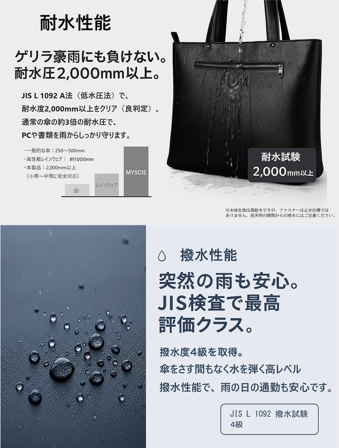 表面は撥水加工、内装は撥水ナイロン。小雨や水滴程度であれば弾きやすい素材です。(※撥水・耐水仕様。完全防水ではありません)