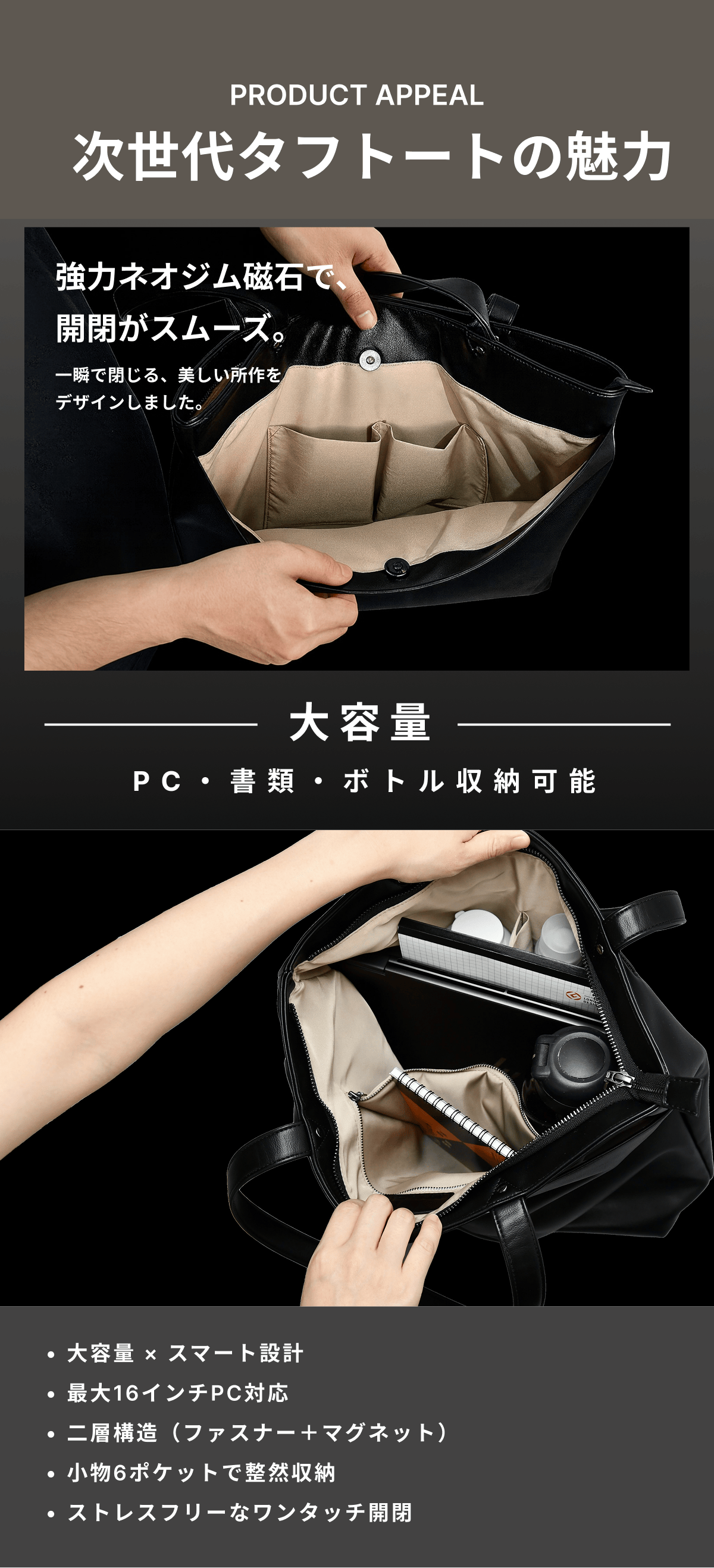 16インチPC、A4書類、ペンケース、水筒、財布など、通勤〜1泊分を想定した容量です。2層構造+6ポケットで整理しやすく、スムーズに出し入れできます。