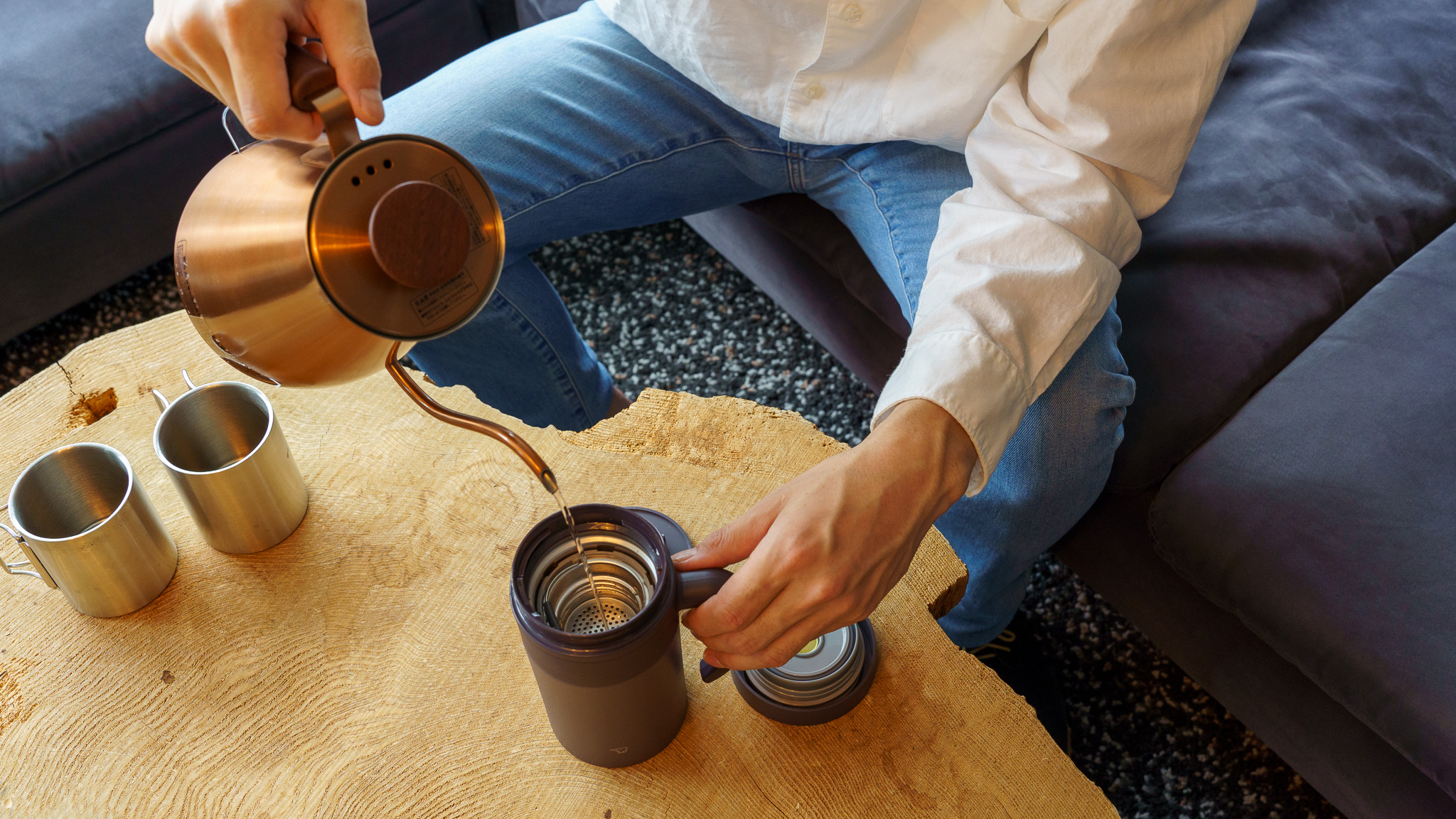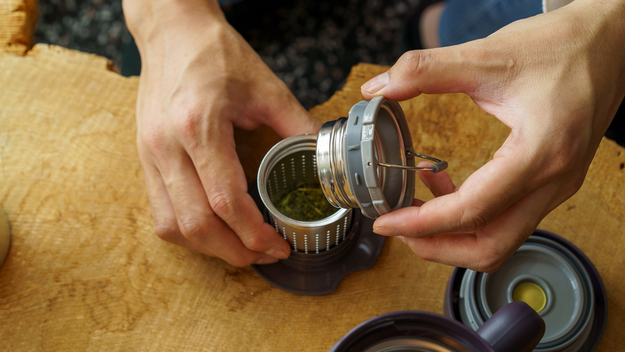 適量の茶葉を茶こしに入れ、写真の茶葉ストッパーをはめれば準備完了。そのまま茶こしをタンブラーにセットして湯または水に浸せば、ホットもアイスもどちらも手軽に、本格的な味わいを楽しめます。