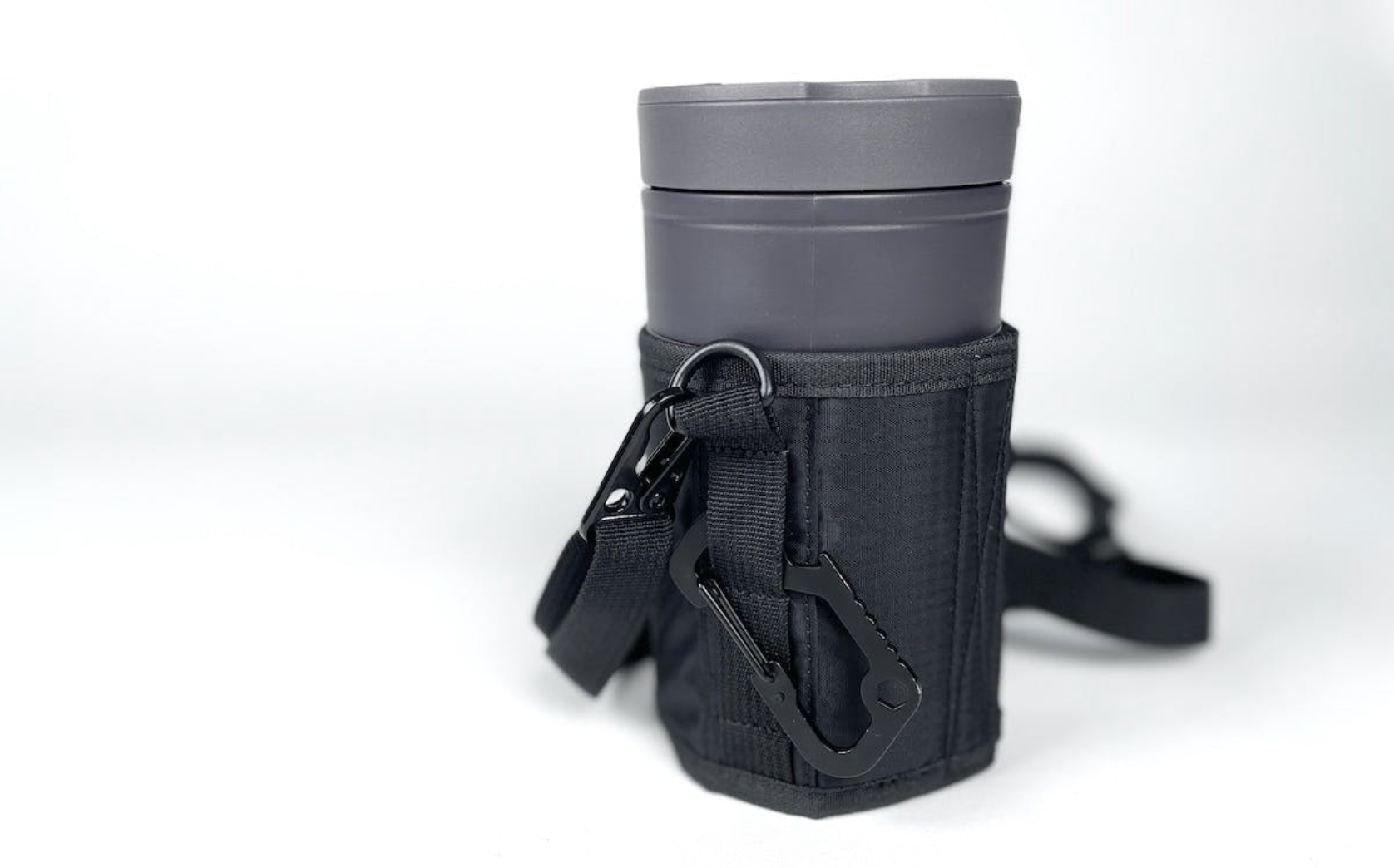 さらに専用ストラップのカバー部分にはウェビングテープがついているので、ここにカラビナをつけて収納力を拡張させても。