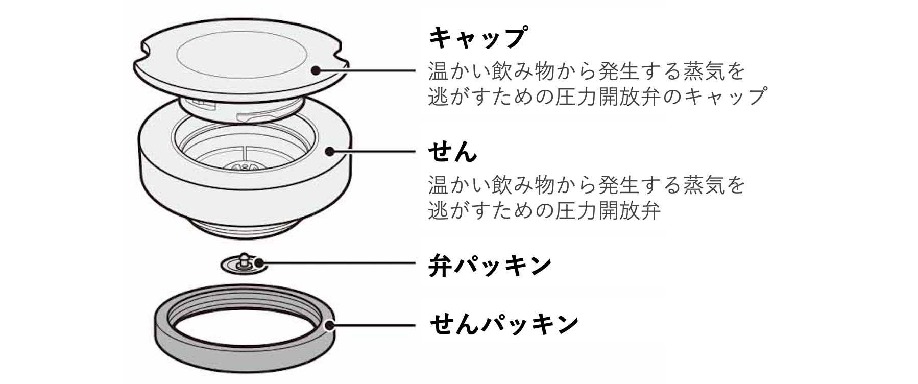シリコーンゴム製のパッキンと、温かい飲み物から発生する蒸気を逃がすための圧力開放弁を搭載することで、一滴の漏れも許しません。