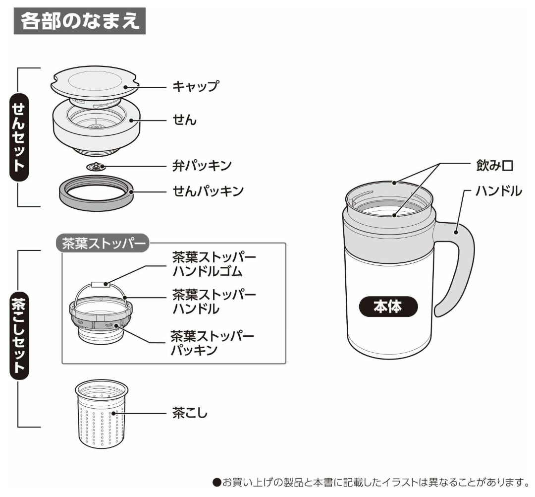 材質:胴部/ステンレス鋼(アクリル樹脂塗装)、内びん/ステンレス鋼、口部/ポリプロピレン、せんキット/ポリプロピレン、パッキン/シリコーンゴム、茶こしセット/ステンレス鋼